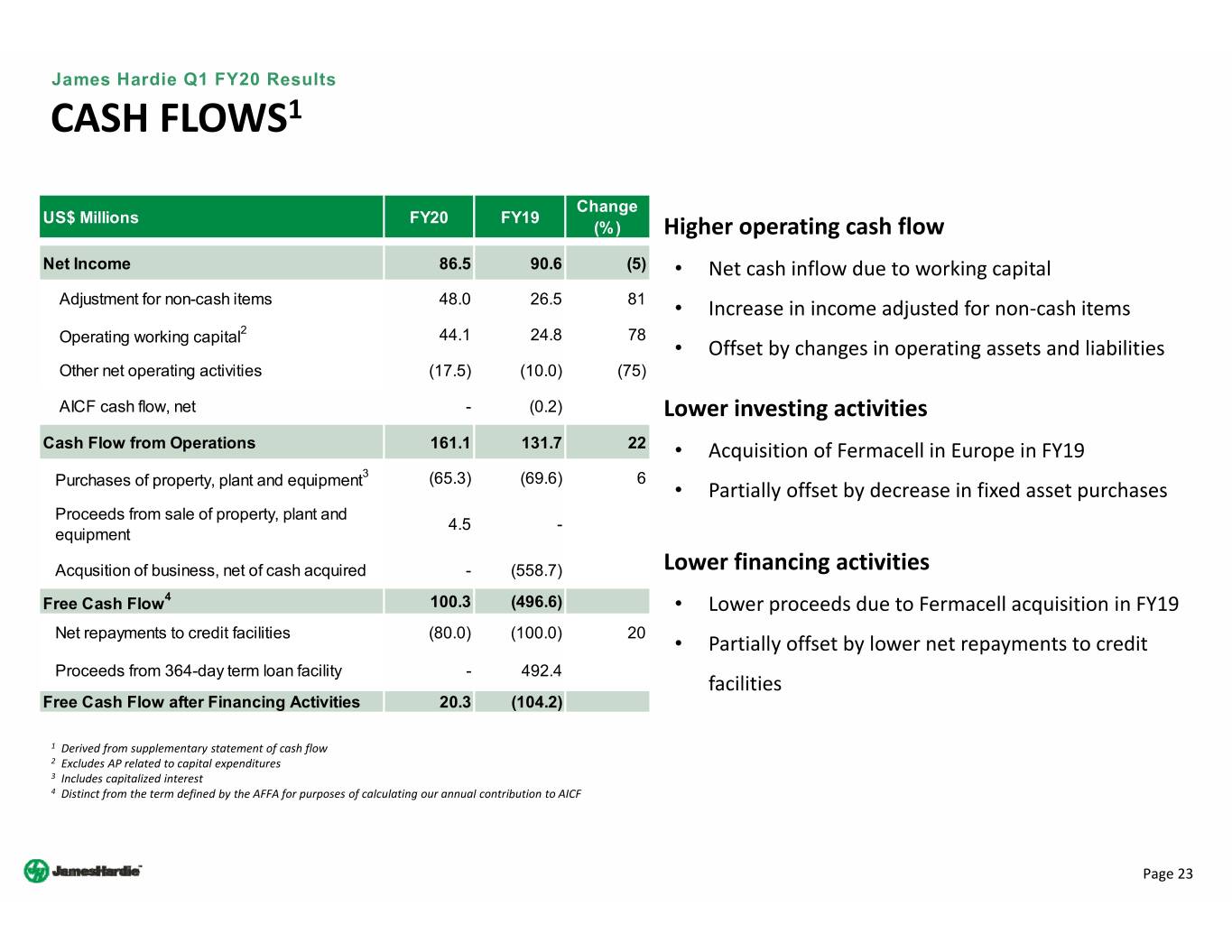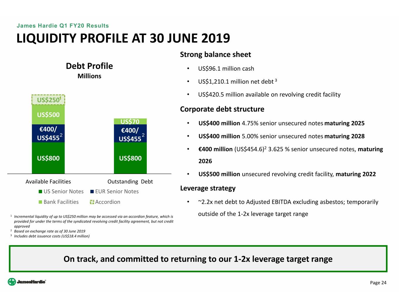 James Hardie Q1 FY20 Results CASH FLOWS1 Change US$ Millions FY20 FY19 (% ) Higher operating cash flow Net Income 86.5 90.6 (5) • Net cash inflow due to working capital 1 Adjustment for non-cash items 48.0 26.5 81 • Increase in income adjusted for non‐cash items Operating working capital2 44.1 24.8 78 • Offset by changes in operating assets and liabilities Other net operating activities (17.5) (10.0) (75) AICF cash flow, net - (0.2) Lower investing activities Cash Flow from Operations 161.1 131.7 22 • Acquisition of Fermacell in Europe in FY19 3 (65.3) (69.6) 6 Purchases of property, plant and equipment • Partially offset by decrease in fixed asset purchases Proceeds from sale of property, plant and 4.5 - equipment Acqusition of business, net of cash acquired - (558.7) Lower financing activities Free Cash Flow4 100.3 (496.6) • Lower proceeds due to Fermacell acquisition in FY19 Net repayments to credit facilities (80.0) (100.0) 20 • Partially offset by lower net repayments to credit Proceeds from 364-day term loan facility - 492.4 facilities Free Cash Flow after Financing Activities 20.3 (104.2) 1 Derived from supplementary statement of cash flow 2 Excludes AP related to capital expenditures 3 Includes capitalized interest 4 Distinct from the term defined by the AFFA for purposes of calculating our annual contribution to AICF Page 23