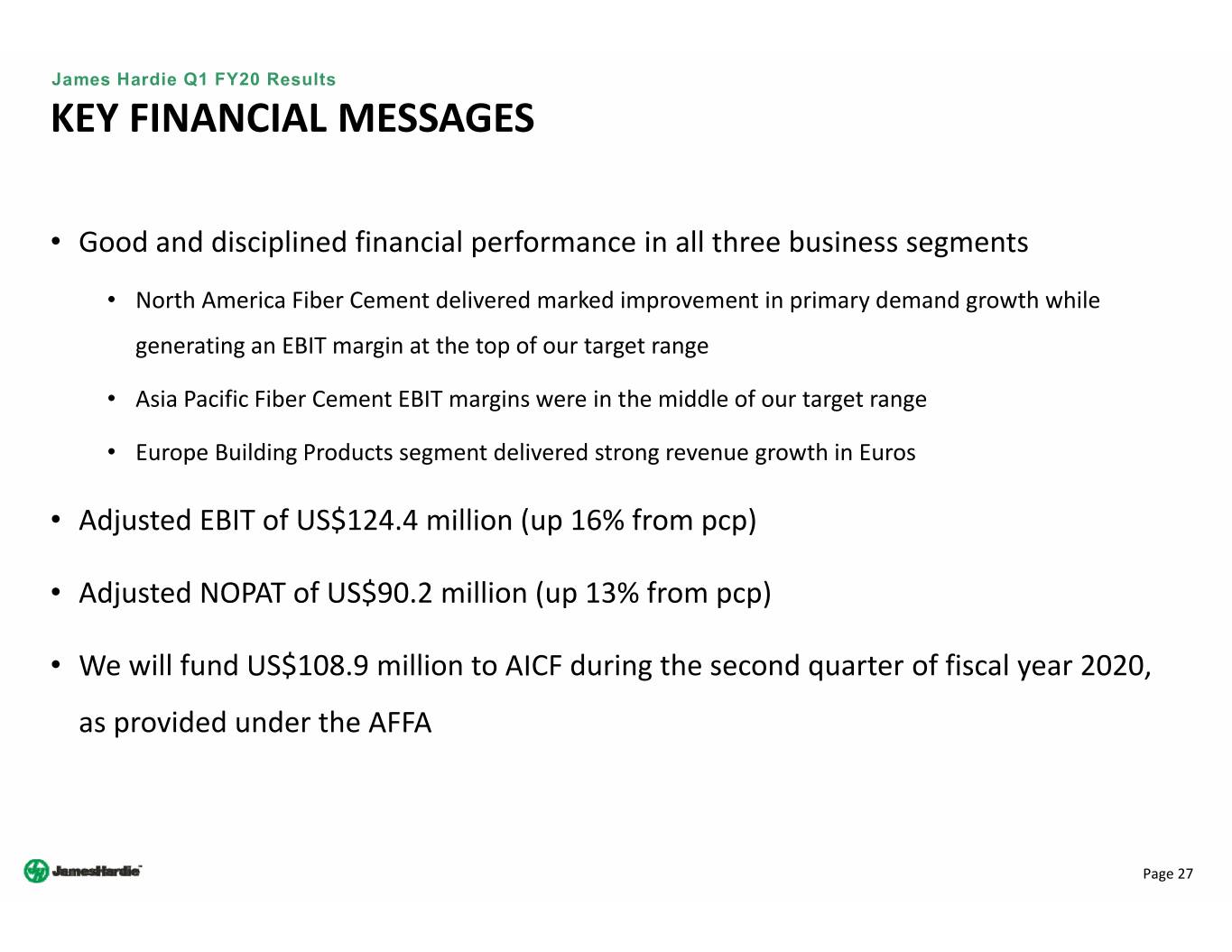 James Hardie Q1 FY20 Results KEY FINANCIAL MESSAGES • Good and disciplined financial performance in all three business segments • North America Fiber Cement delivered marked improvement in primary demand growth while generating an EBIT margin at the top of our target range • Asia Pacific Fiber Cement EBIT margins were in the middle of our target range • Europe Building Products segment delivered strong revenue growth in Euros • Adjusted EBIT of US$124.4 million (up 16% from pcp) • Adjusted NOPAT of US$90.2 million (up 13% from pcp) • We will fund US$108.9 million to AICF during the second quarter of fiscal year 2020, as provided under the AFFA Page 27
