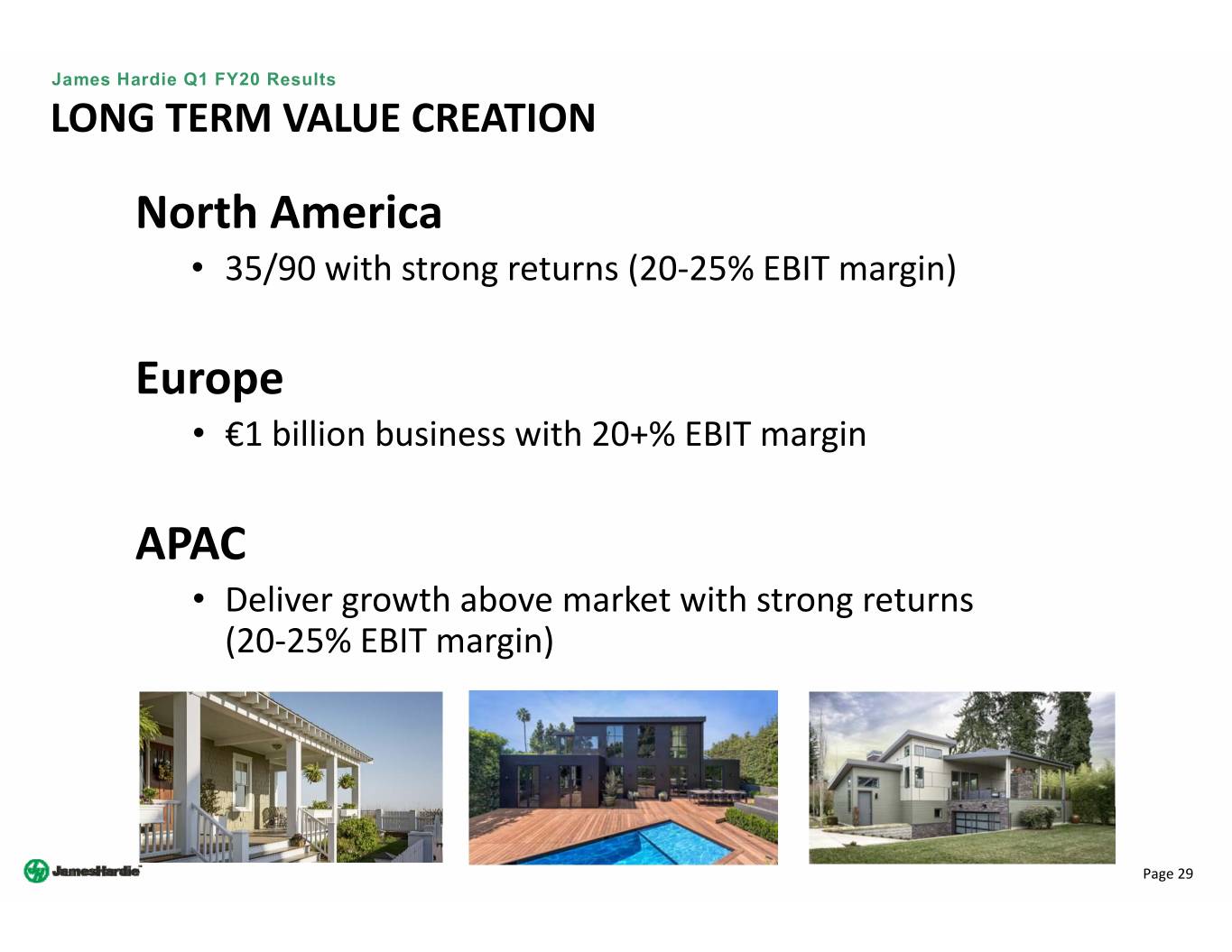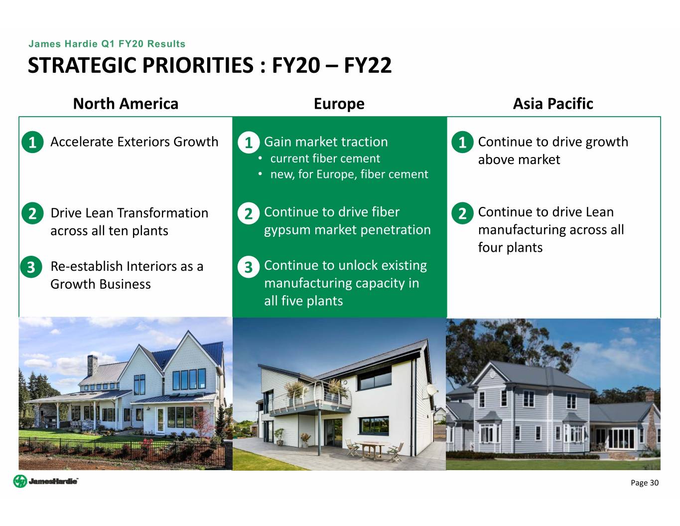 James Hardie Q1 FY20 Results LONG TERM VALUE CREATION North America • 35/90 with strong returns (20‐25% EBIT margin) Europe • €1 billion business with 20+% EBIT margin APAC • Deliver growth above market with strong returns (20‐25% EBIT margin) Page 29