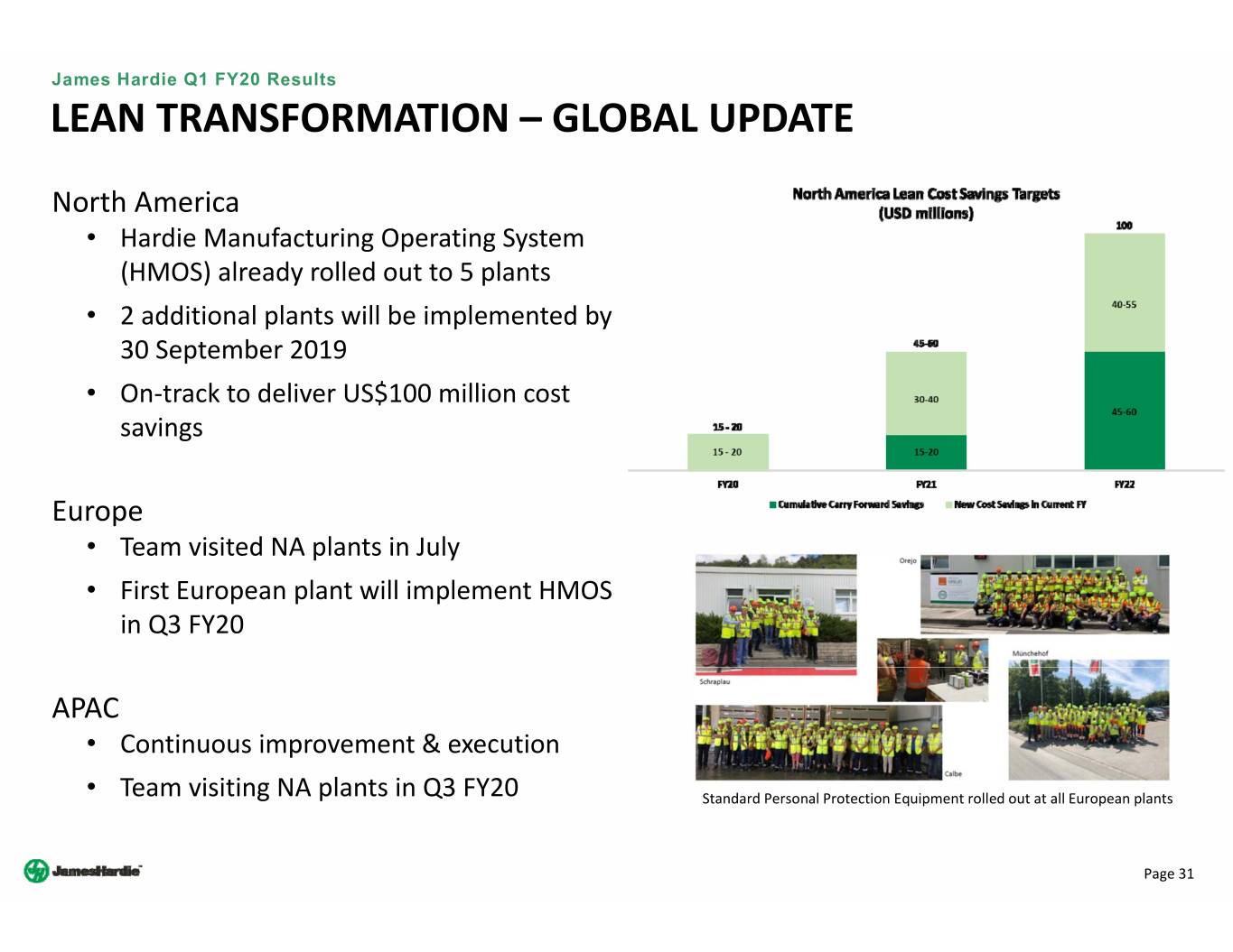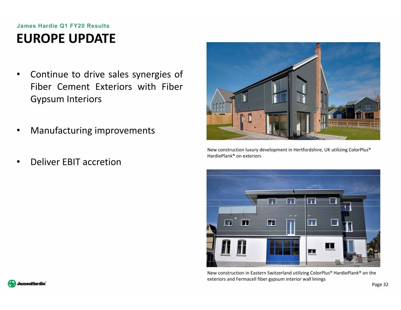 James Hardie Q1 FY20 Results LEAN TRANSFORMATION – GLOBAL UPDATE North America • Hardie Manufacturing Operating System (HMOS) already rolled out to 5 plants • 2 additional plants will be implemented by 30 September 2019 • On‐track to deliver US$100 million cost savings Europe • Team visited NA plants in July • First European plant will implement HMOS in Q3 FY20 APAC • Continuous improvement & execution • Team visiting NA plants in Q3 FY20 Standard Personal Protection Equipment rolled out at all European plants Page 31
