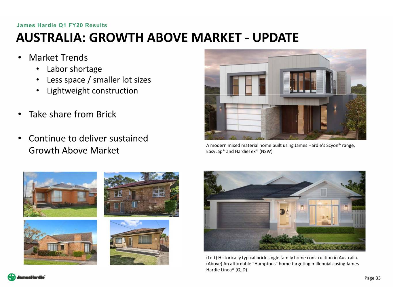 James Hardie Q1 FY20 Results EUROPE UPDATE • Continue to drive sales synergies of Fiber Cement Exteriors with Fiber Gypsum Interiors • Manufacturing improvements New construction luxury development in Hertfordshire, UK utilizing ColorPlus® HardiePlank® on exteriors • Deliver EBIT accretion New construction in Eastern Switzerland utilizing ColorPlus® HardiePlank® on the exteriors and Fermacell fiber gypsum interior wall linings Page 32