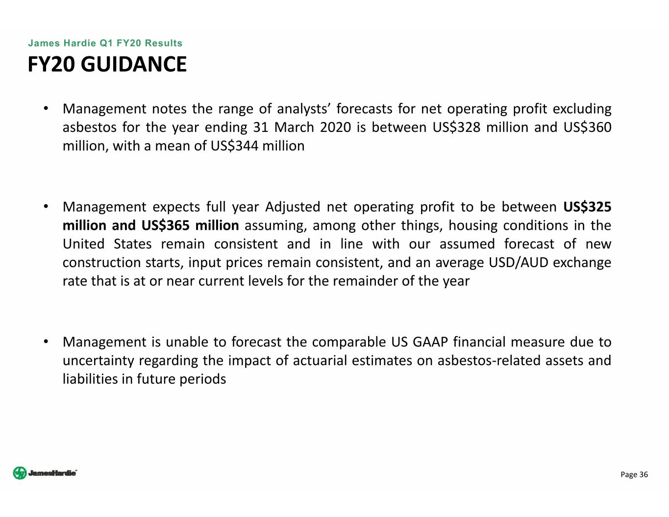 James Hardie Q1 FY20 Results FY20 GUIDANCE • Management notes the range of analysts’ forecasts for net operating profitexcluding asbestos for the year ending 31 March 2020 is between US$328 million and US$360 million, with a mean of US$344 million • Management expects full year Adjusted net operating profit to be between US$325 million and US$365 million assuming, among other things, housing conditions in the UnitedStatesremainconsistentandinlinewithourassumedforecastofnew construction starts, input prices remain consistent, and an average USD/AUD exchange rate that is at or near current levels for the remainder of the year • Management is unable to forecast the comparable US GAAP financial measure due to uncertainty regarding the impact of actuarial estimates on asbestos‐related assets and liabilities in future periods Page 36