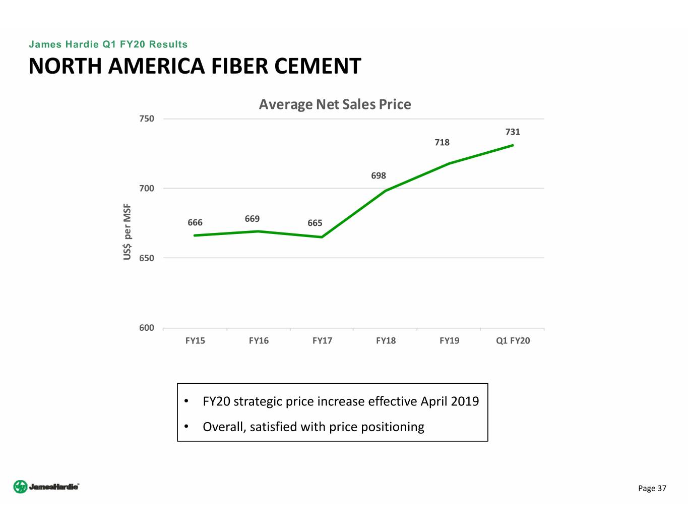 James Hardie Q1 FY20 Results NORTH AMERICA FIBER CEMENT Average Net Sales Price 750 731 718 698 700 666 669 665 US$ per MSF 650 600 FY15 FY16 FY17 FY18 FY19 Q1 FY20 • FY20 strategic price increase effective April 2019 • Overall, satisfied with price positioning Page 37