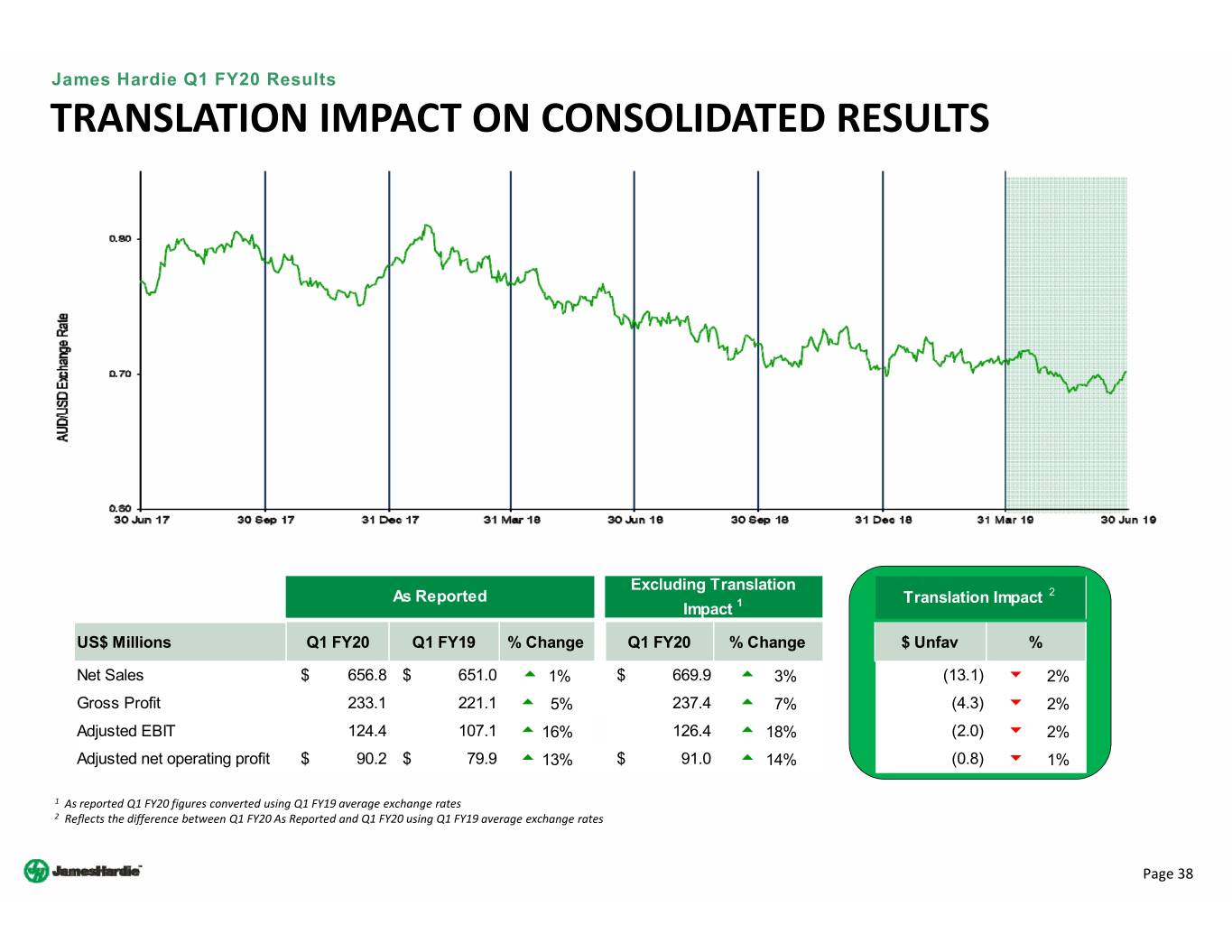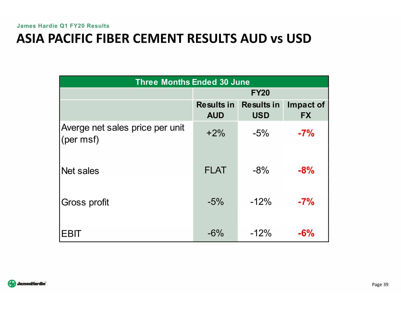 James Hardie Q1 FY20 Results TRANSLATION IMPACT ON CONSOLIDATED RESULTS Excluding Translation As R e porte d Translation Impact 2 Impact 1 US$ Millions Q1 FY20 Q1 FY19 % Change Q1 FY20 % Change $ Unfav % Net Sales $ 656.8 $ 651.0 1% $ 669.9 3% (13.1) 2% Gross Profit 233.1 221.1 5% 237.4 7% (4.3) 2% Adjusted EBIT 124.4 107.1 16% 126.4 18% (2.0) 2% Adjusted net operating profit $ 90.2 $ 79.9 13% $ 91.0 14% (0.8) 1% 1 As reported Q1 FY20 figures converted using Q1 FY19 average exchange rates 2 Reflects the difference between Q1 FY20 As Reported and Q1 FY20 using Q1 FY19 average exchange rates Page 38