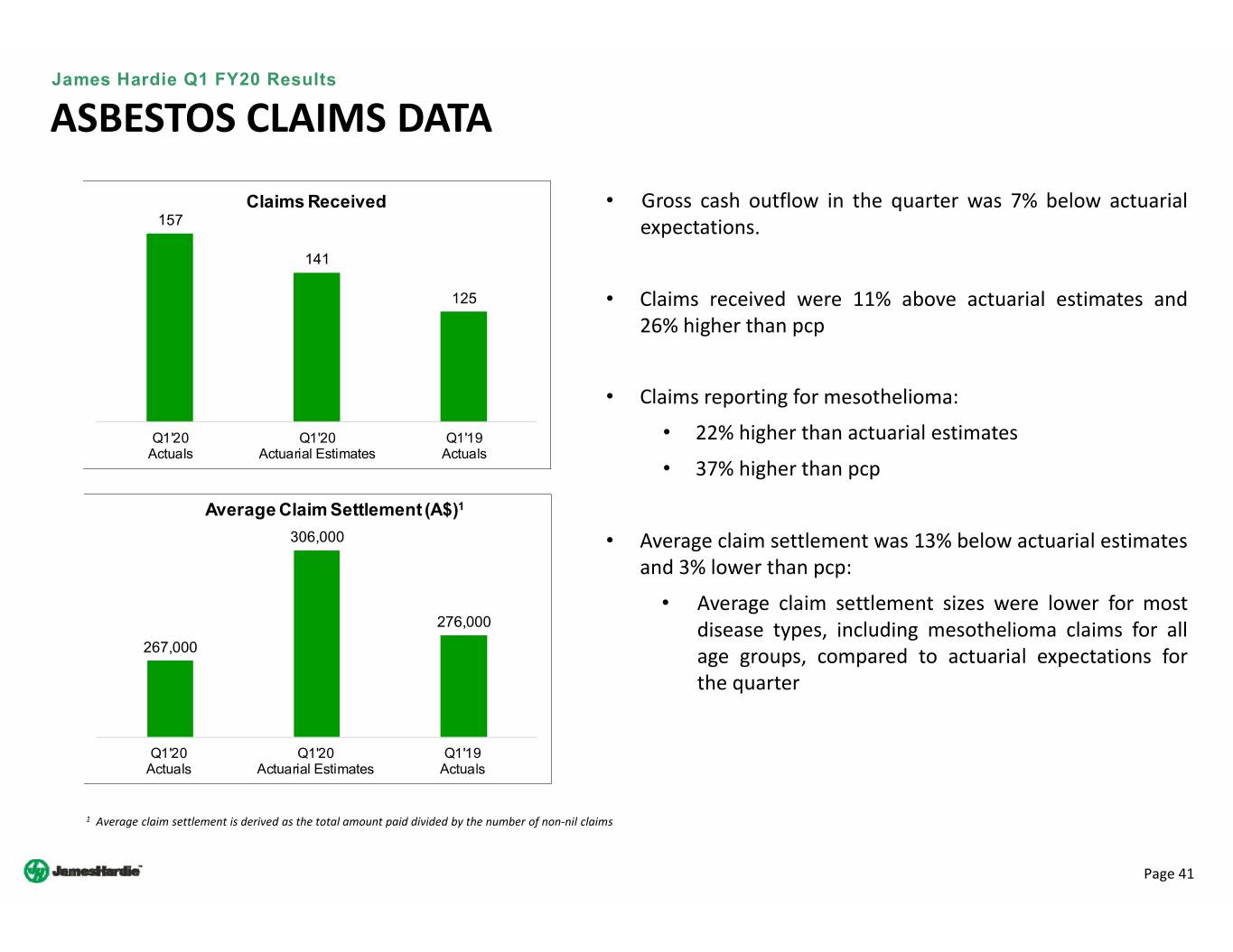 James Hardie Q1 FY20 Results ASBESTOS CLAIMS DATA Claims Received • Gross cash outflow in the quarter was 7% below actuarial 157 expectations. 141 125 • Claims received were 11% above actuarial estimates and 26% higher than pcp • Claims reporting for mesothelioma: Q1'20 Q1'20 Q1'19 • 22% higher than actuarial estimates Actuals Actuarial Estimates Actuals • 37% higher than pcp Average Claim Settlement (A$)1 306,000 • Average claim settlement was 13% below actuarial estimates and 3% lower than pcp: • Average claim settlement sizes were lower for most 276,000 disease types, including mesothelioma claims for all 267,000 age groups, compared to actuarial expectations for the quarter Q1'20 Q1'20 Q1'19 Actuals Actuarial Estimates Actuals 1 Average claim settlement is derived as the total amount paid divided by the number of non‐nil claims Page 41