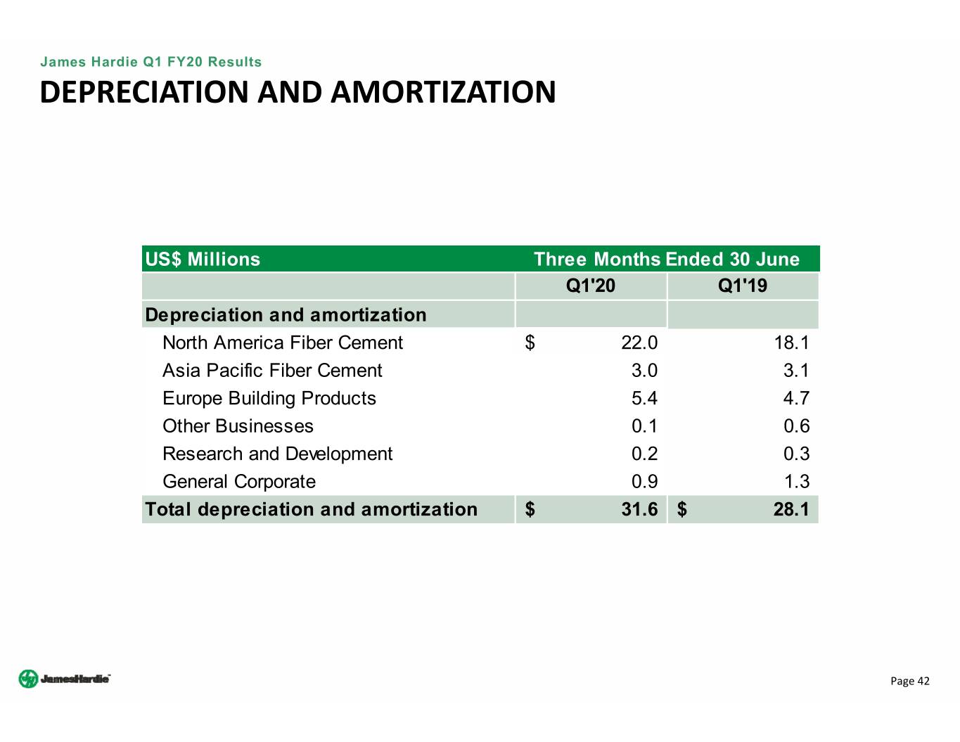 James Hardie Q1 FY20 Results DEPRECIATION AND AMORTIZATION US$ Millions Three Months Ended 30 June Q1'20 Q1'19 Depreciation and amortization North America Fiber Cement$ 22.0 18.1 Asia Pacific Fiber Cement 3.0 3.1 Europe Building Products 5.4 4.7 Other Businesses 0.1 0.6 Research and Development 0.2 0.3 General Corporate 0.9 1.3 Total depreciation and amortization$ 31.6 $ 28.1 Page 42
