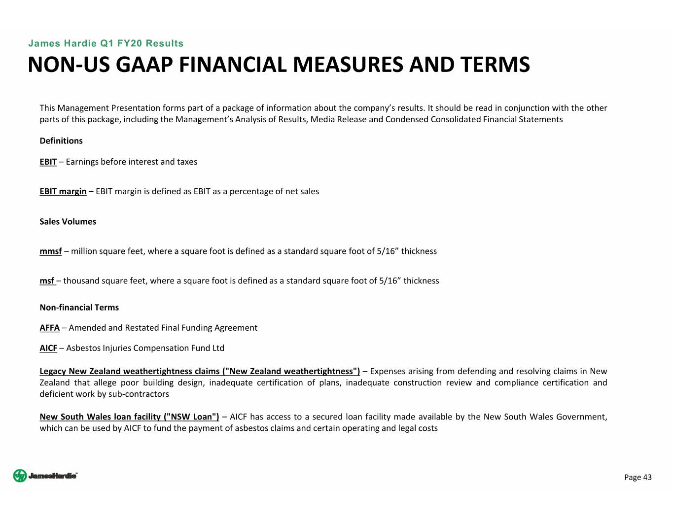 James Hardie Q1 FY20 Results NON‐US GAAP FINANCIAL MEASURES AND TERMS This Management Presentation forms part of a package of information about the company’s results. It should be read in conjunction with the other parts of this package, including the Management’s Analysis of Results, Media Release and Condensed Consolidated Financial Statements Definitions EBIT – Earnings before interest and taxes EBIT margin – EBIT margin is defined as EBIT as a percentage of net sales Sales Volumes mmsf – million square feet, where a square foot is defined as a standard square foot of 5/16” thickness msf – thousand square feet, where a square foot is defined as a standard square foot of 5/16” thickness Non‐financial Terms AFFA – Amended and Restated Final Funding Agreement AICF – Asbestos Injuries Compensation Fund Ltd Legacy New Zealand weathertightness claims ("New Zealand weathertightness") – Expenses arising from defending and resolving claims in New Zealand that allege poor building design, inadequate certification of plans, inadequate construction review and compliance certification and deficient work by sub‐contractors New South Wales loan facility ("NSW Loan") – AICF has access to a secured loan facility made available by the New South Wales Government, which can be used by AICF to fund the payment of asbestos claims and certain operating and legal costs Page 43