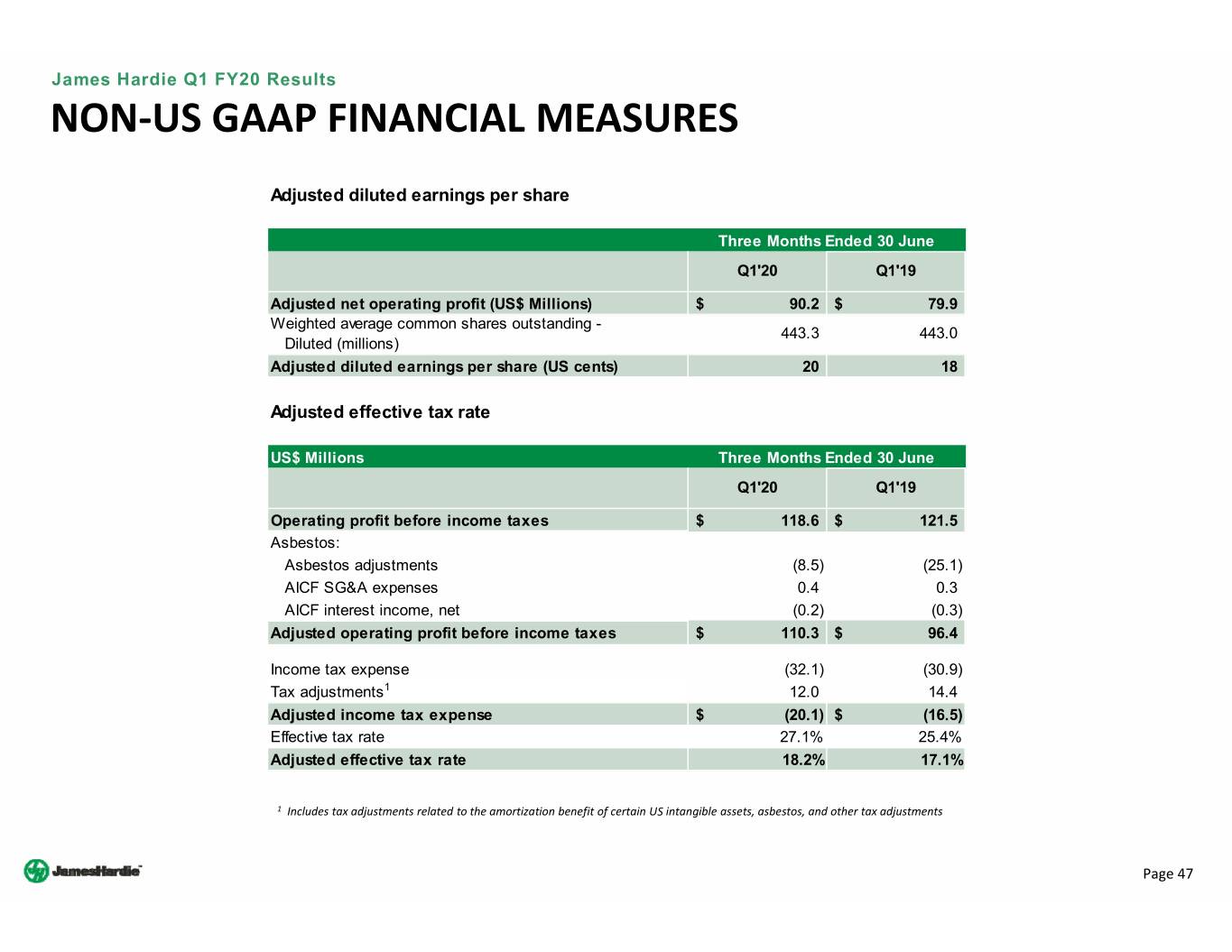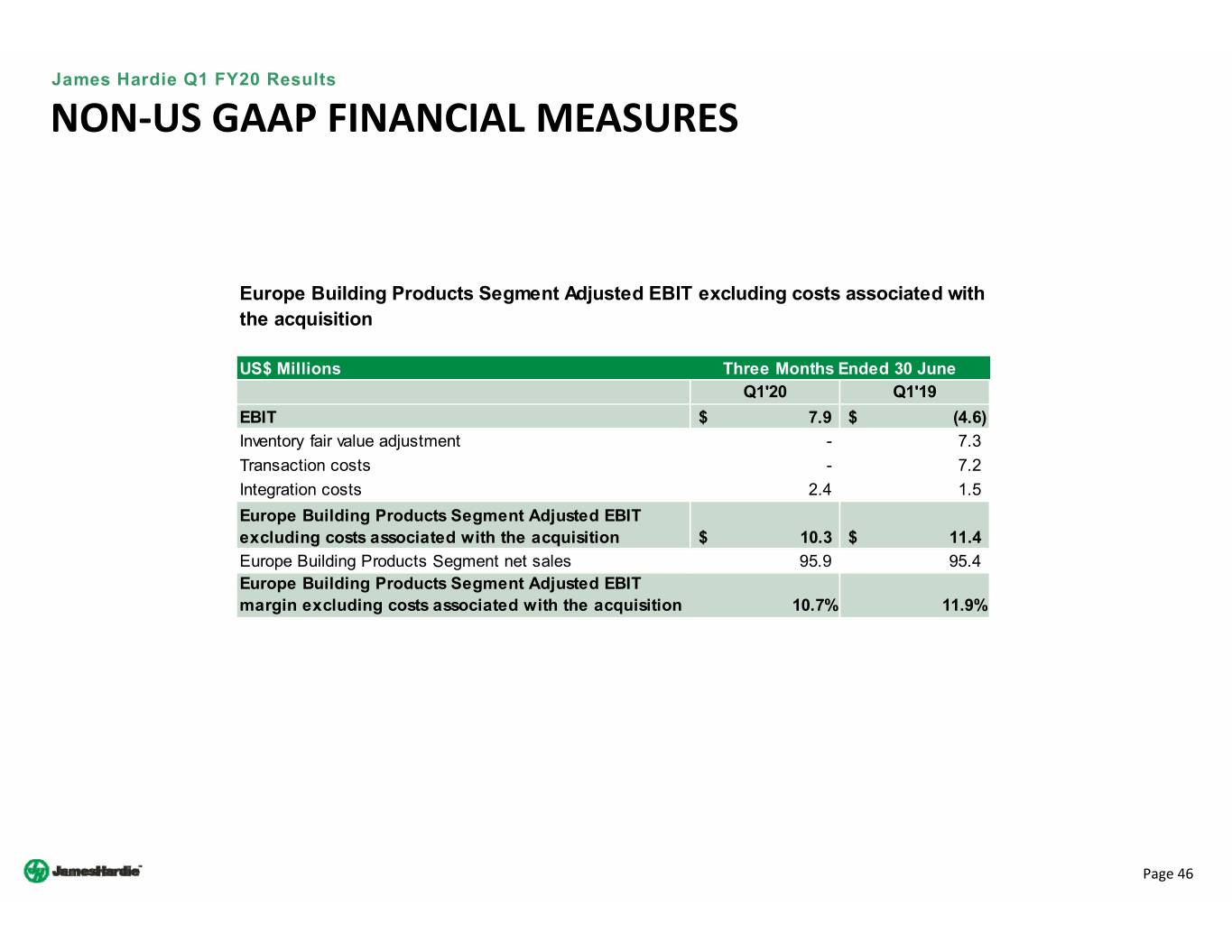 James Hardie Q1 FY20 Results NON‐US GAAP FINANCIAL MEASURES Financial Measures – US GAAP equivalents Adjusted EBIT US$ Millions Three Months Ended 30 June Q1'20 Q1'19 EBIT$ 132.5 $ 131.9 Asbestos: Asbestos adjustments (8.5) (25.1) AICF SG&A expenses 0.4 0.3 Adjusted EBIT $ 124.4 $ 107.1 Net sales 656.8 651.0 Adjusted EBIT margin 18.9% 16.5% Adjusted net operating profit US$ Millions Three Months Ended 30 June Q1'20 Q1'19 Net operating profit $ 86.5 $ 90.6 Asbestos: Asbestos adjustments (8.5) (25.1) AICF SG&A expenses 0.4 0.3 AICF interest income, net (0.2) (0.3) Tax adjustments1 12.0 14.4 Adjusted net operating profit $ 90.2 $ 79.9 1 Includes tax adjustments related to the amortization benefit of certain US intangible assets, asbestos, and other tax adjustments Page 45