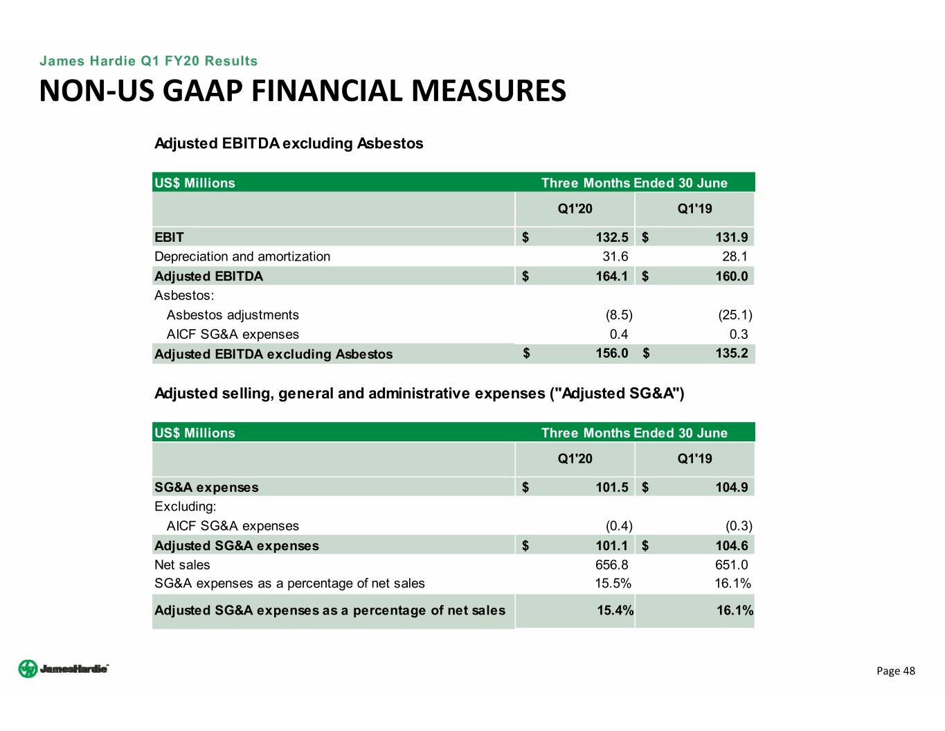 James Hardie Q1 FY20 Results NON‐US GAAP FINANCIAL MEASURES Adjusted EBITDA excluding Asbestos US$ Millions Three Months Ended 30 June Q1'20 Q1'19 EBIT$ 132.5 $ 131.9 Depreciation and amortization 31.6 28.1 Adjusted EBITDA $ 164.1 $ 160.0 Asbestos: Asbestos adjustments (8.5) (25.1) AICF SG&A expenses 0.4 0.3 Adjusted EBITDA excluding Asbestos $ 156.0 $ 135.2 Adjusted selling, general and administrative expenses ("Adjusted SG&A") US$ Millions Three Months Ended 30 June Q1'20 Q1'19 SG&A expenses$ 101.5 $ 104.9 Excluding: AICF SG&A expenses (0.4) (0.3) Adjusted SG&A expenses $ 101.1 $ 104.6 Net sales 656.8 651.0 SG&A expenses as a percentage of net sales 15.5% 16.1% Adjusted SG&A expenses as a percentage of net sales 15.4% 16.1% Page 48