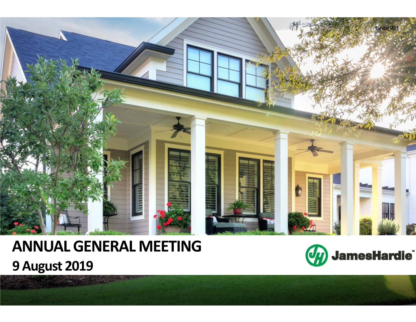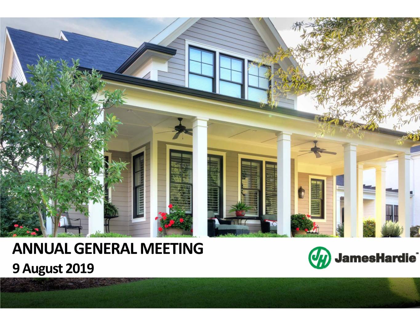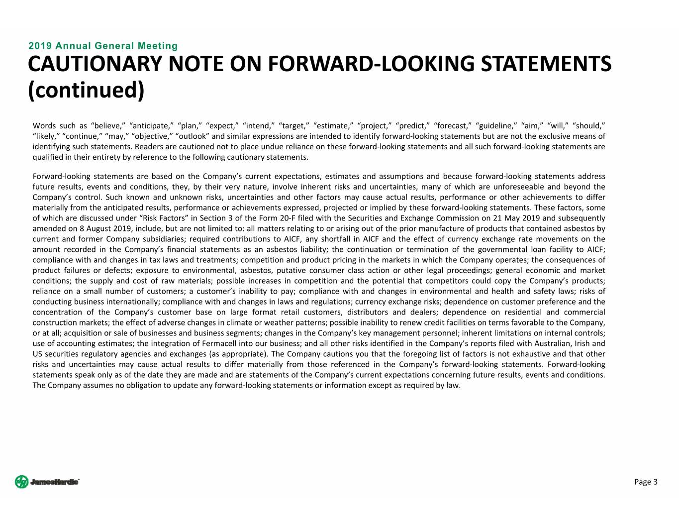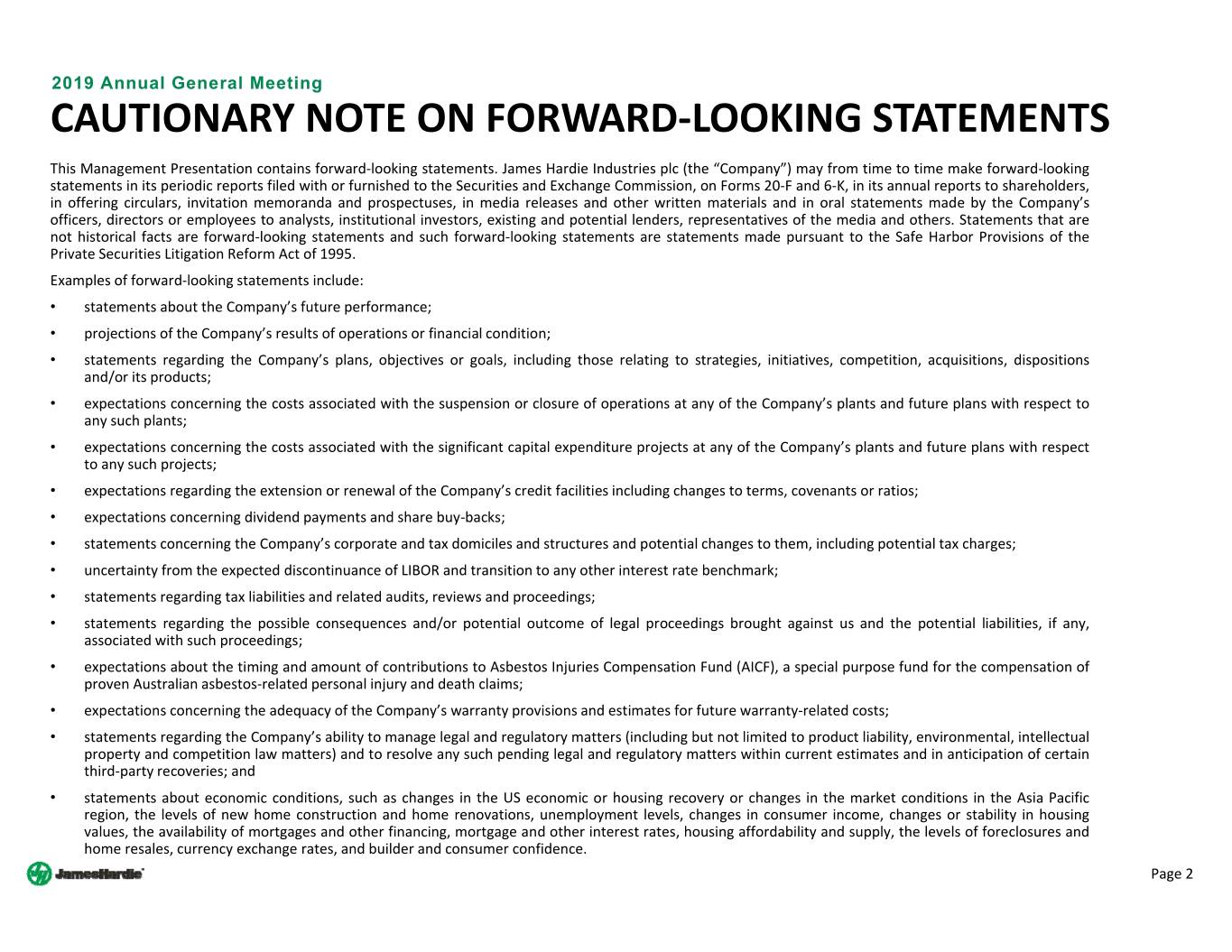 2019 Annual General Meeting CAUTIONARY NOTE ON FORWARD‐LOOKING STATEMENTS This Management Presentation contains forward‐looking statements. James Hardie Industries plc (the “Company”) may from time to time make forward‐looking statements in its periodic reports filed with or furnished to the Securities and Exchange Commission, on Forms 20‐F and 6‐K, in its annual reports to shareholders, in offering circulars, invitation memoranda and prospectuses, in media releases and other written materials and in oral statements made by the Company’s officers, directors or employees to analysts, institutional investors, existing and potential lenders, representatives of the media and others. Statements that are not historical facts are forward‐looking statements and such forward‐looking statements are statements made pursuant to the Safe Harbor Provisions of the Private Securities Litigation Reform Act of 1995. Examples of forward‐looking statements include: • statements about the Company’s future performance; • projections of the Company’s results of operations or financial condition; • statements regarding the Company’s plans, objectives or goals, including those relating to strategies, initiatives, competition, acquisitions,dispositions and/or its products; • expectations concerning the costs associated with the suspension or closure of operations at any of the Company’s plants and future plans with respect to any such plants; • expectations concerning the costs associated with the significant capital expenditure projects at any of the Company’s plants and future plans withrespect to any such projects; • expectations regarding the extension or renewal of the Company’s credit facilities including changes to terms, covenants or ratios; • expectations concerning dividend payments and share buy‐backs; • statements concerning the Company’s corporate and tax domiciles and structures and potential changes to them, including potential tax charges; • uncertainty from the expected discontinuance of LIBOR and transition to any other interest rate benchmark; • statements regarding tax liabilities and related audits, reviews and proceedings; • statements regarding the possible consequences and/or potential outcome of legal proceedings brought against us and the potential liabilities, ifany, associated with such proceedings; • expectations about the timing and amount of contributions to Asbestos Injuries Compensation Fund (AICF), a special purpose fund for the compensation of proven Australian asbestos‐related personal injury and death claims; • expectations concerning the adequacy of the Company’s warranty provisions and estimates for future warranty‐related costs; • statements regarding the Company’s ability to manage legal and regulatory matters (including but not limited to product liability, environmental, intellectual property and competition law matters) and to resolve any such pending legal and regulatory matters within current estimates and in anticipation of certain third‐party recoveries; and • statements about economic conditions, such as changes in the US economic or housing recovery or changes in the market conditions in the Asia Pacific region, the levels of new home construction and home renovations, unemployment levels, changes in consumer income, changes or stability in housing values, the availability of mortgages and other financing, mortgage and other interest rates, housing affordability and supply, the levels of foreclosures and home resales, currency exchange rates, and builder and consumer confidence. Page 2