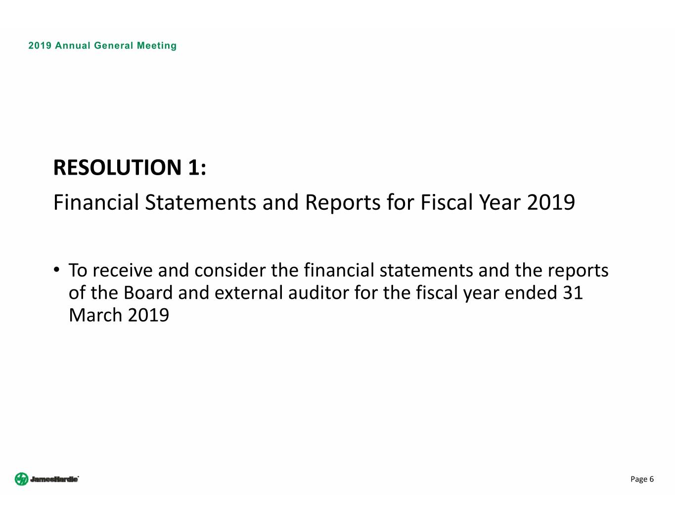 2019 Annual General Meeting RESOLUTION 1: Financial Statements and Reports for Fiscal Year 2019 • To receive and consider the financial statements and the reports of the Board and external auditor for the fiscal year ended 31 March 2019 Page 6