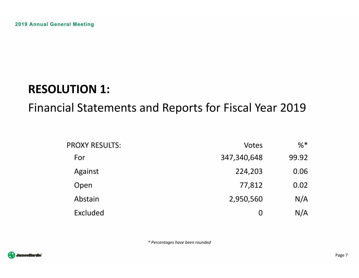2019 Annual General Meeting RESOLUTION 1: Financial Statements and Reports for Fiscal Year 2019 PROXY RESULTS: Votes %* For 347,340,648 99.92 Against 224,203 0.06 Open 77,812 0.02 Abstain 2,950,560 N/A Excluded 0 N/A * Percentages have been rounded Page 7