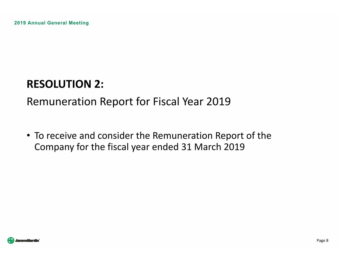 2019 Annual General Meeting RESOLUTION 2: Remuneration Report for Fiscal Year 2019 • To receive and consider the Remuneration Report of the Company for the fiscal year ended 31 March 2019 Page 8