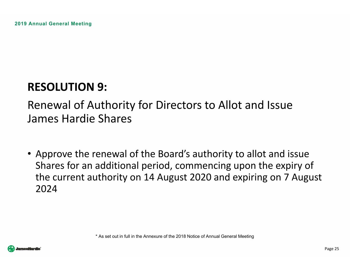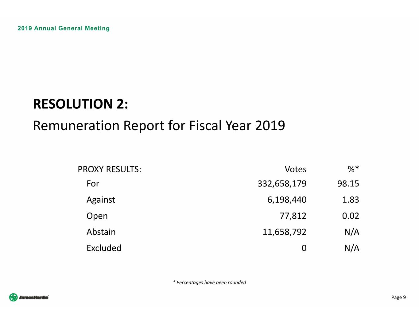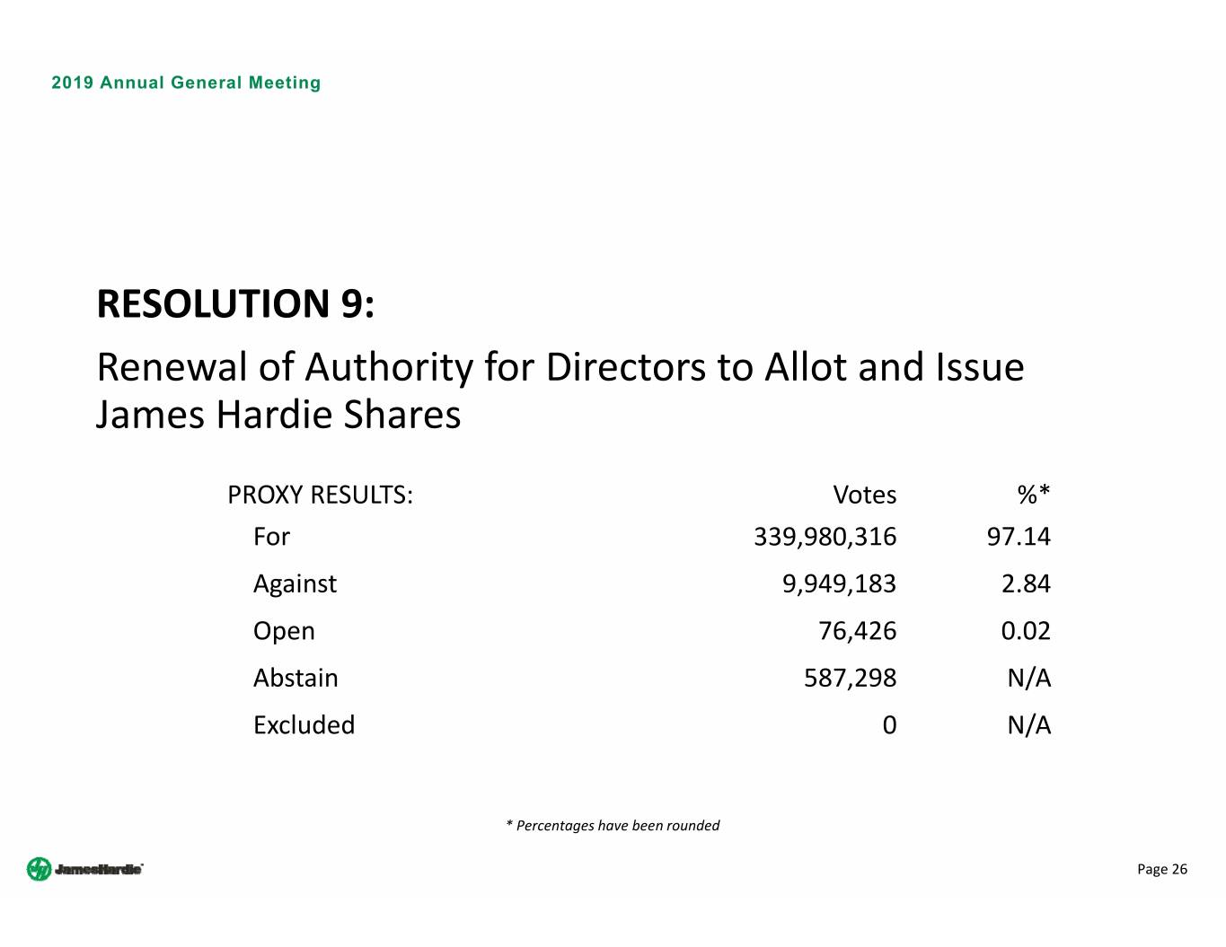 2019 Annual General Meeting RESOLUTION 9: Renewal of Authority for Directors to Allot and Issue James Hardie Shares PROXY RESULTS: Votes %* For 339,980,316 97.14 Against 9,949,183 2.84 Open 76,426 0.02 Abstain 587,298 N/A Excluded 0 N/A * Percentages have been rounded Page 26