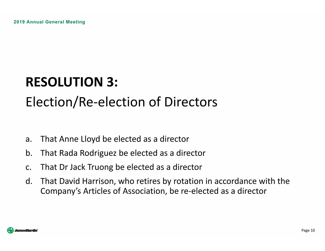 2019 Annual General Meeting CAUTIONARY NOTE ON FORWARD‐LOOKING STATEMENTS (continued) Words such as “believe,” “anticipate,” “plan,” “expect,” “intend,” “target,” “estimate,” “project,” “predict,” “forecast,” “guideline,” “aim,” “will,” “should,” “likely,” “continue,” “may,” “objective,” “outlook” and similar expressions are intended to identify forward‐looking statements but are not the exclusive means of identifying such statements. Readers are cautioned not to place undue reliance on these forward‐looking statements and all such forward‐looking statements are qualified in their entirety by reference to the following cautionary statements. Forward‐looking statements are based on the Company’s current expectations, estimates and assumptions and because forward‐looking statements address future results, events and conditions, they, by their very nature, involve inherent risks and uncertainties, many of which are unforeseeable and beyond the Company’s control. Such known and unknown risks, uncertainties and other factors may cause actual results, performance or other achievements to differ materially from the anticipated results, performance or achievements expressed, projected or implied by these forward‐looking statements. Thesefactors,some of which are discussed under “Risk Factors” in Section 3 of the Form 20‐F filed with the Securities and Exchange Commission on 21 May 2019 and subsequently amended on 8 August 2019, include, but are not limited to: all matters relating to or arising out of the prior manufacture of products that contained asbestos by current and former Company subsidiaries; required contributions to AICF, any shortfall in AICF and the effect of currency exchange rate movements onthe amount recorded in the Company’s financial statements as an asbestos liability; the continuation or termination of the governmental loan facility to AICF; compliance with and changes in tax laws and treatments; competition and product pricing in the markets in which the Company operates; the consequences of product failures or defects; exposure to environmental, asbestos, putative consumer class action or other legal proceedings; general economic andmarket conditions; the supply and cost of raw materials; possible increases in competition and the potential that competitors could copy the Company’s products; reliance on a small number of customers; a customer’s inability to pay; compliance with and changes in environmental and health and safety laws; risksof conducting business internationally; compliance with and changes in laws and regulations; currency exchange risks; dependence on customer preference and the concentration of the Company’s customer base on large format retail customers, distributors and dealers; dependence on residential and commercial construction markets; the effect of adverse changes in climate or weather patterns; possible inability to renew credit facilities on terms favorable to the Company, or at all; acquisition or sale of businesses and business segments; changes in the Company’s key management personnel; inherent limitations on internal controls; use of accounting estimates; the integration of Fermacell into our business; and all other risks identified in the Company’s reports filed with Australian, Irish and US securities regulatory agencies and exchanges (as appropriate). The Company cautions you that the foregoing listoffactorsisnotexhaustiveandthat other risks and uncertainties may cause actual results to differ materially from those referenced in the Company’s forward‐looking statements. Forward‐looking statements speak only as of the date they are made and are statements of the Company’s current expectations concerning future results, events and conditions. The Company assumes no obligation to update any forward‐looking statements or information except as required by law. Page 3