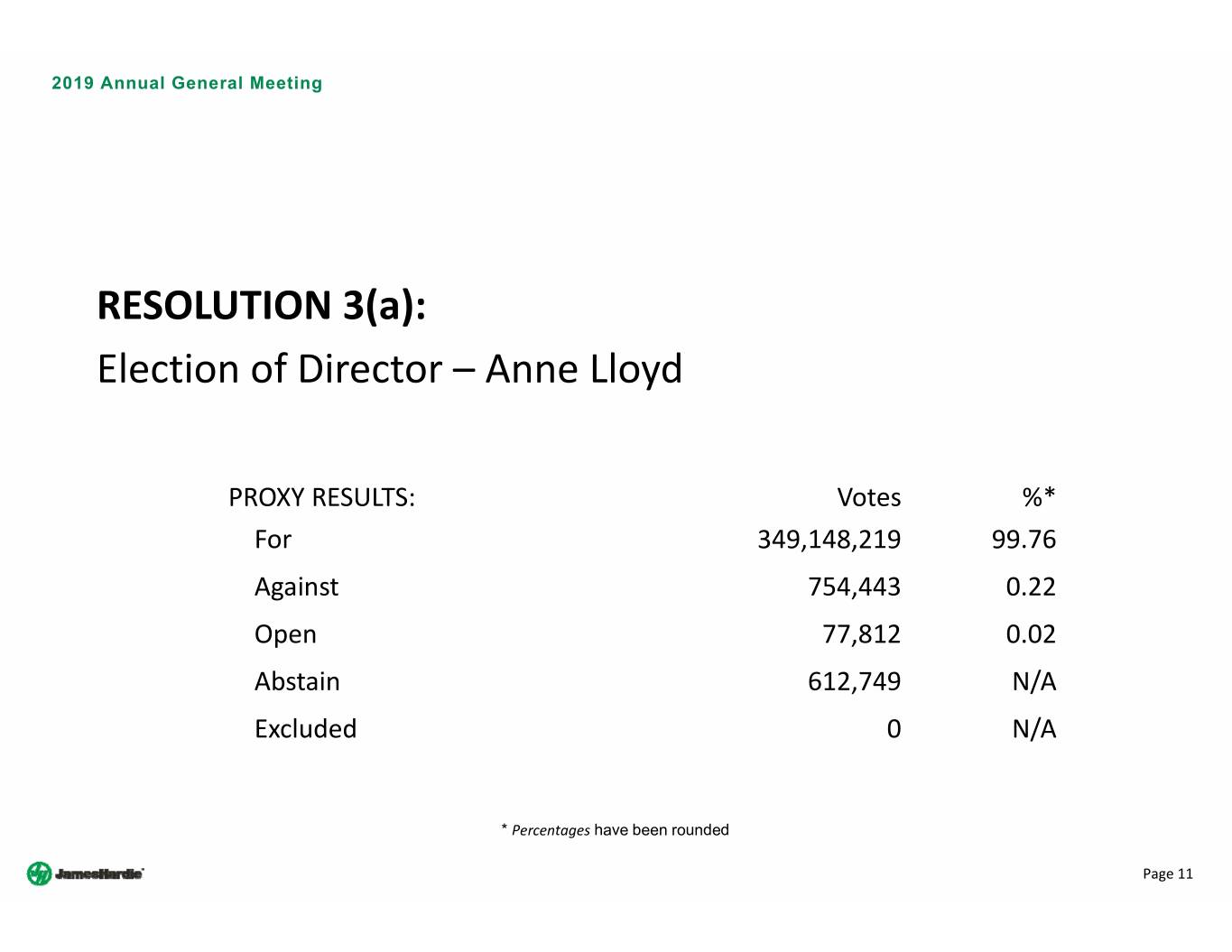 2019 Annual General Meeting RESOLUTION 3(a): Election of Director – Anne Lloyd PROXY RESULTS: Votes %* For 349,148,219 99.76 Against 754,443 0.22 Open 77,812 0.02 Abstain 612,749 N/A Excluded 0 N/A * Percentages have been rounded Page 11