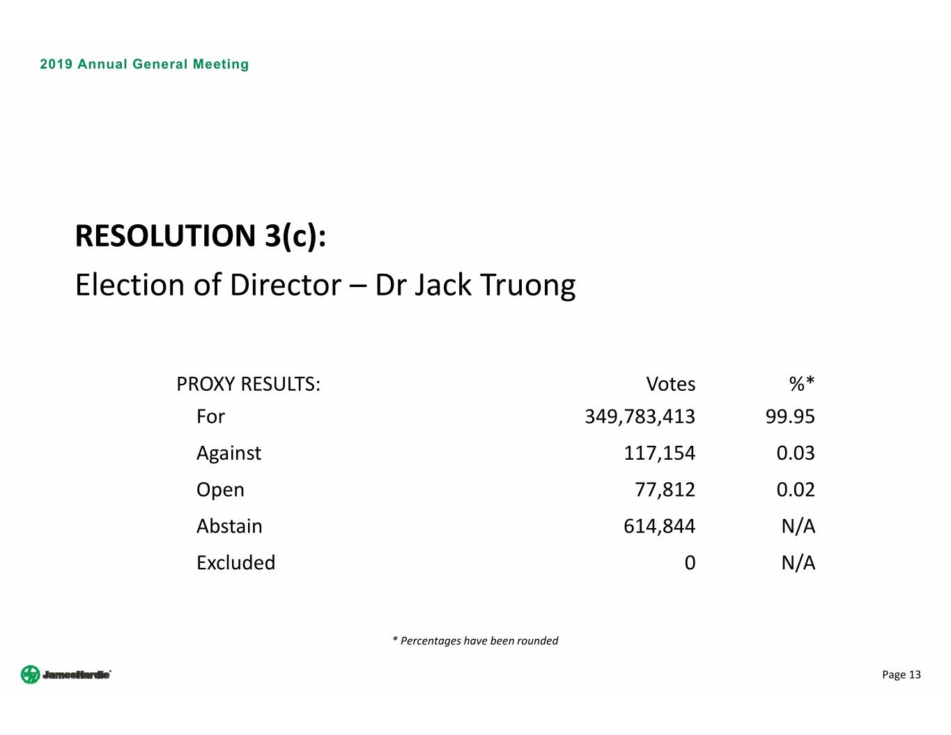 2019 Annual General Meeting RESOLUTION 3(b): Election of Director – Rada Rodriguez PROXY RESULTS: Votes %* For 349,783,671 99.95 Against 118,126 0.03 Open 77,812 0.02 Abstain 613,614 N/A Excluded 0 N/A * Percentages have been rounded Page 12