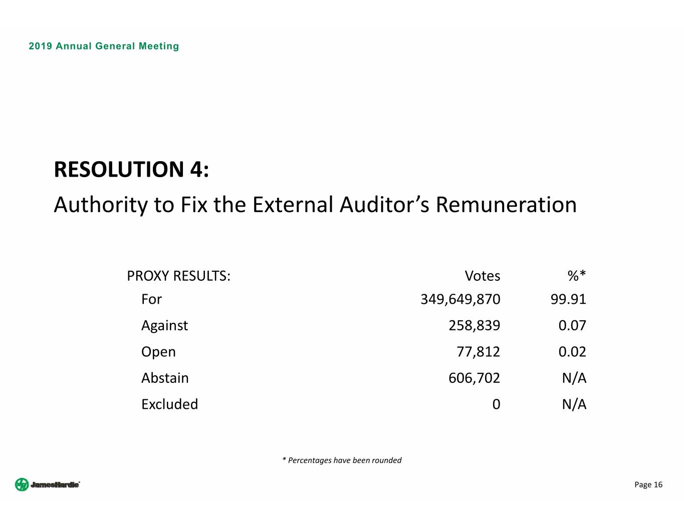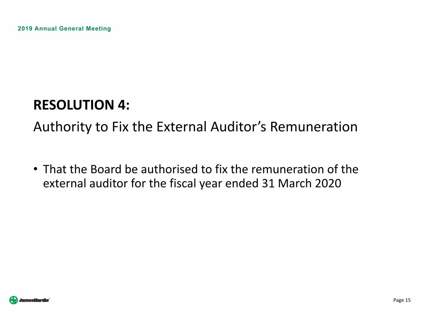 2019 Annual General Meeting RESOLUTION 4: Authority to Fix the External Auditor’s Remuneration • That the Board be authorised to fix the remuneration of the external auditor for the fiscal year ended 31 March 2020 Page 15