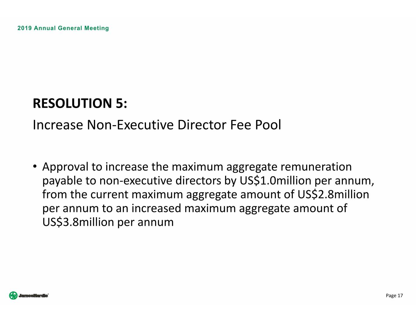 2019 Annual General Meeting RESOLUTION 5: Increase Non‐Executive Director Fee Pool • Approval to increase the maximum aggregate remuneration payable to non‐executive directors by US$1.0million per annum, from the current maximum aggregate amount of US$2.8million per annum to an increased maximum aggregate amount of US$3.8million per annum Page 17