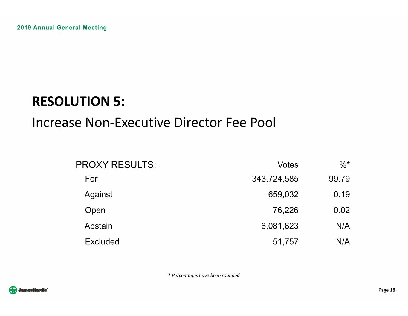 2019 Annual General Meeting RESOLUTION 5: Increase Non‐Executive Director Fee Pool PROXY RESULTS: Votes %* For 343,724,585 99.79 Against 659,032 0.19 Open 76,226 0.02 Abstain 6,081,623 N/A Excluded 51,757 N/A * Percentages have been rounded Page 18
