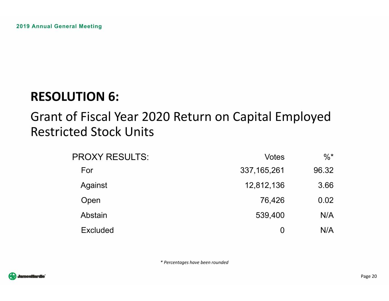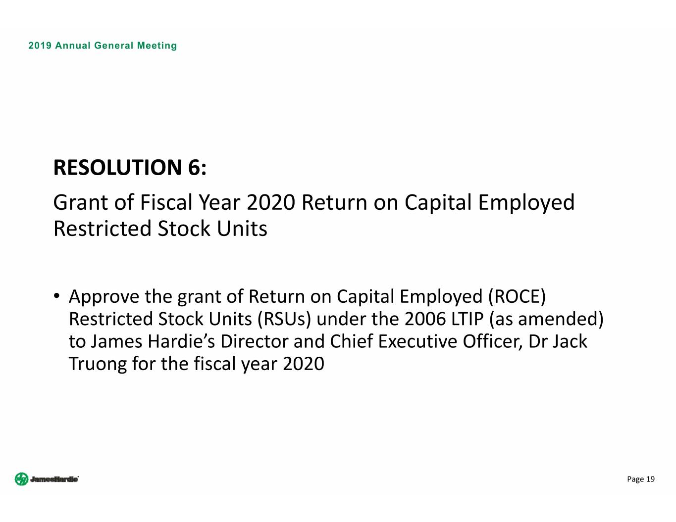 2019 Annual General Meeting RESOLUTION 6: Grant of Fiscal Year 2020 Return on Capital Employed Restricted Stock Units • Approve the grant of Return on Capital Employed (ROCE) Restricted Stock Units (RSUs) under the 2006 LTIP (as amended) to James Hardie’s Director and Chief Executive Officer, Dr Jack Truong for the fiscal year 2020 Page 19