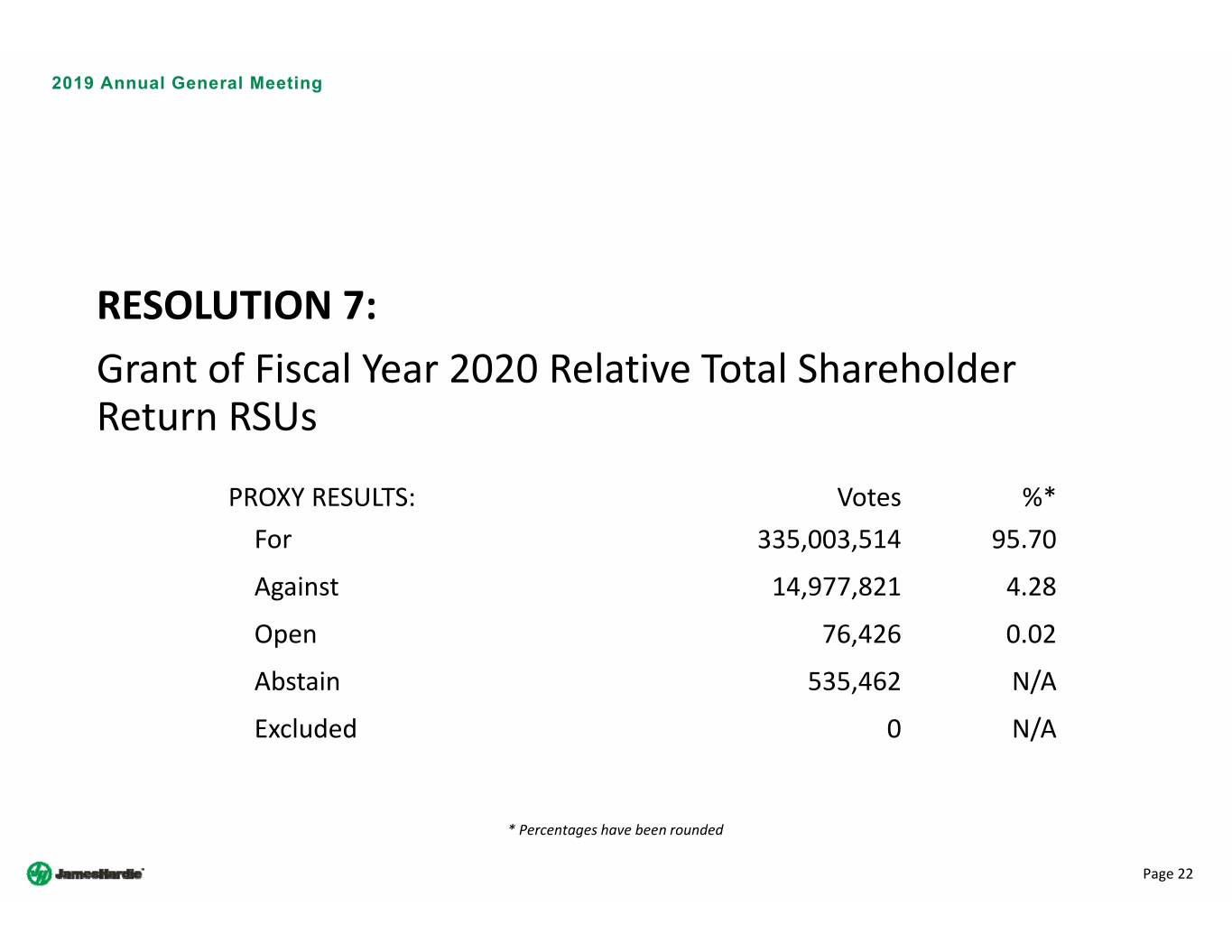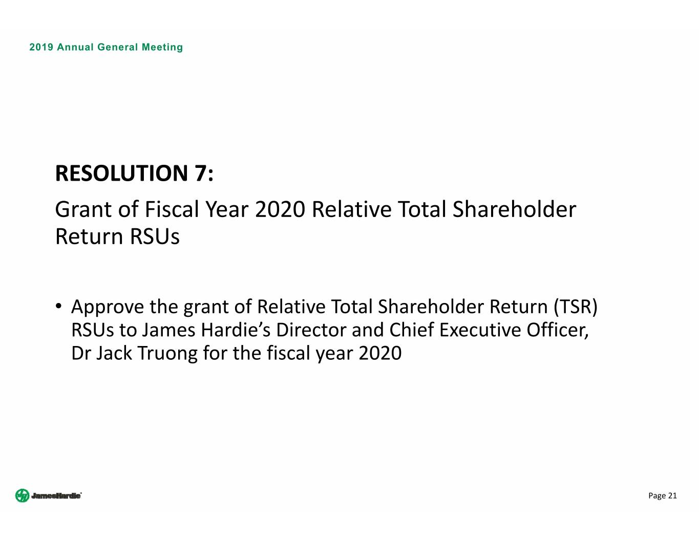 2019 Annual General Meeting RESOLUTION 7: Grant of Fiscal Year 2020 Relative Total Shareholder Return RSUs • Approve the grant of Relative Total Shareholder Return (TSR) RSUs to James Hardie’s Director and Chief Executive Officer, Dr Jack Truong for the fiscal year 2020 Page 21