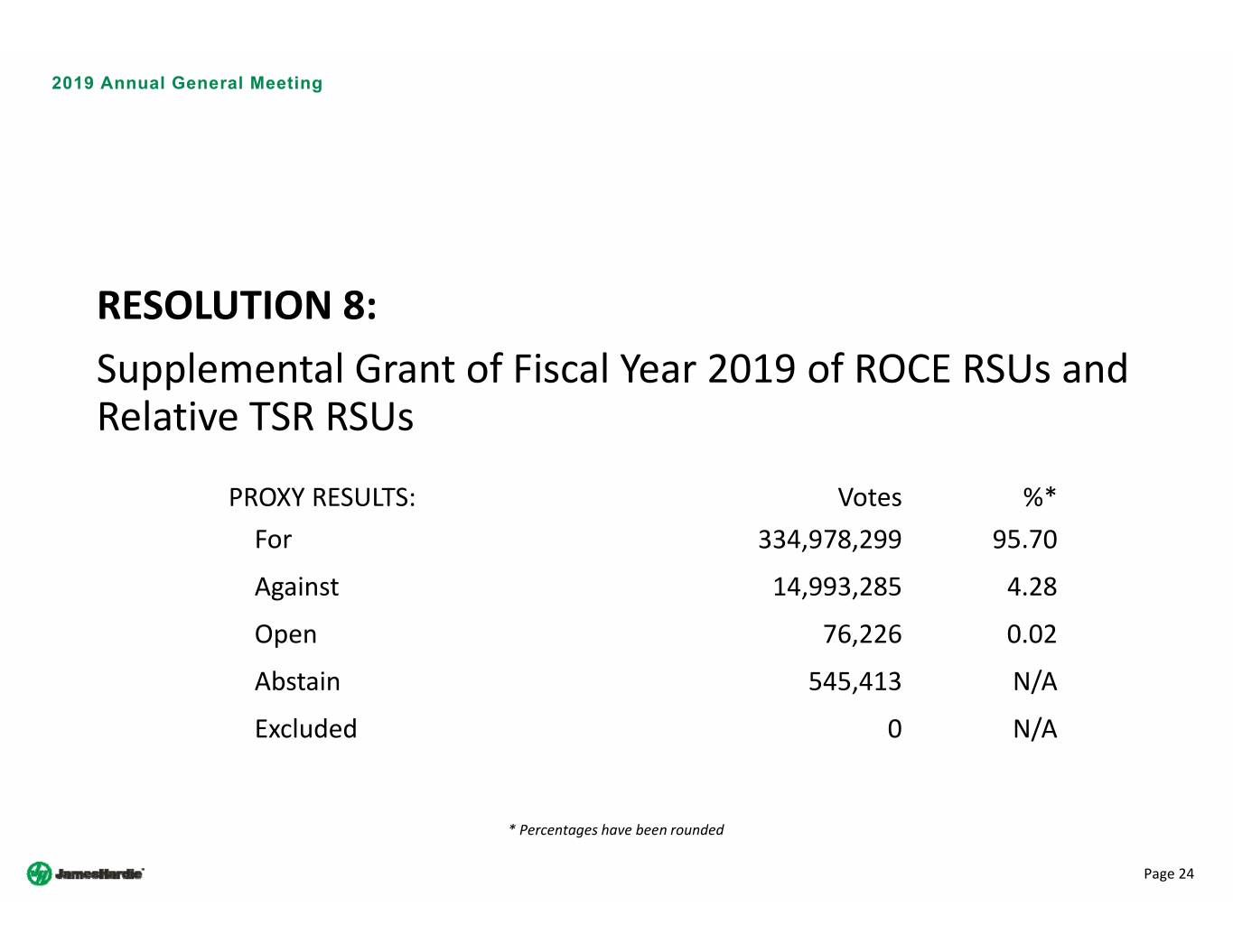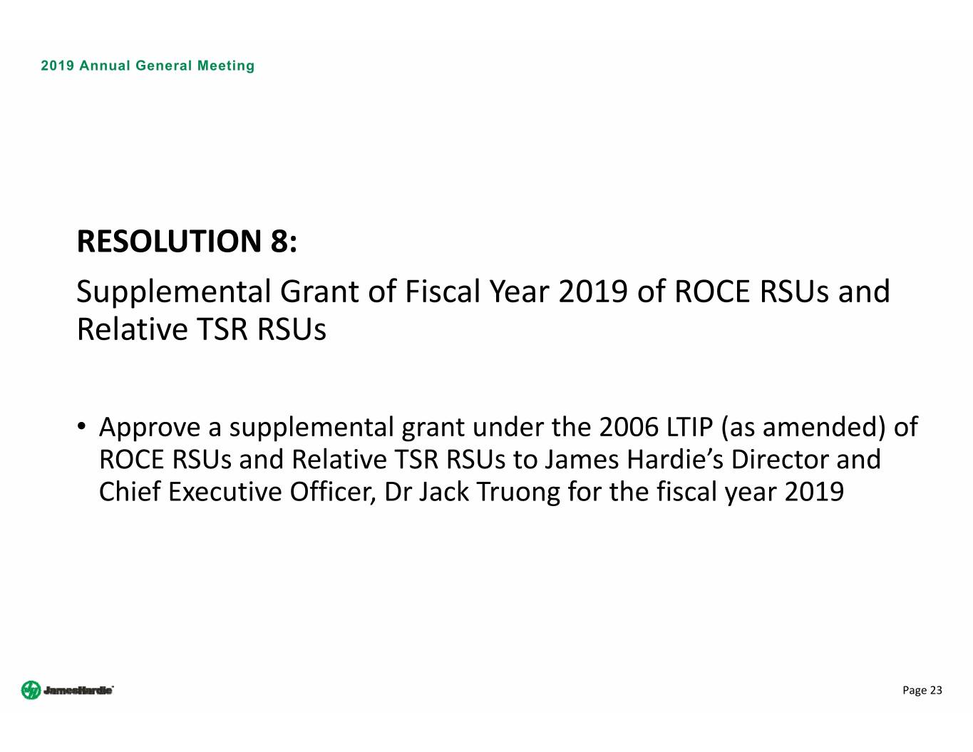 2019 Annual General Meeting RESOLUTION 8: Supplemental Grant of Fiscal Year 2019 of ROCE RSUs and Relative TSR RSUs • Approve a supplemental grant under the 2006 LTIP (as amended) of ROCE RSUs and Relative TSR RSUs to James Hardie’s Director and Chief Executive Officer, Dr Jack Truong for the fiscal year 2019 Page 23