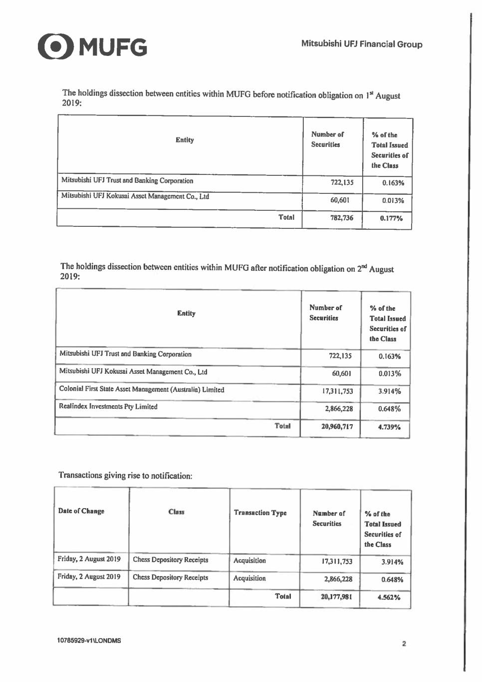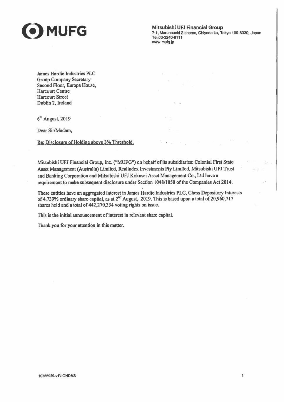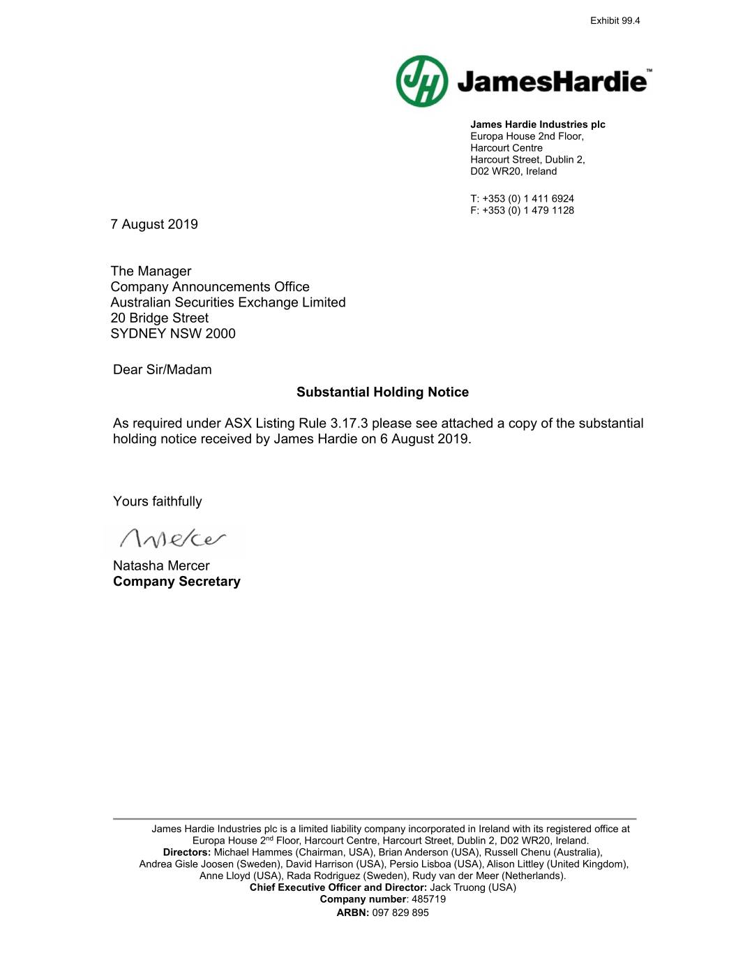 Exhibit 99.4 James Hardie Industries plc Europa House 2nd Floor, Harcourt Centre Harcourt Street, Dublin 2, D02 WR20, Ireland T: +353 (0) 1 411 6924 F: +353 (0) 1 479 1128 7 August 2019 The Manager Company Announcements Office Australian Securities Exchange Limited 20 Bridge Street SYDNEY NSW 2000 Dear Sir/Madam Substantial Holding Notice As required under ASX Listing Rule 3.17.3 please see attached a copy of the substantial holding notice received by James Hardie on 6 August 2019. Yours faithfully Natasha Mercer Company Secretary James Hardie Industries plc is a limited liability company incorporated in Ireland with its registered office at Europa House 2nd Floor, Harcourt Centre, Harcourt Street, Dublin 2, D02 WR20, Ireland. Directors: Michael Hammes (Chairman, USA), Brian Anderson (USA), Russell Chenu (Australia), Andrea Gisle Joosen (Sweden), David Harrison (USA), Persio Lisboa (USA), Alison Littley (United Kingdom), Anne Lloyd (USA), Rada Rodriguez (Sweden), Rudy van der Meer (Netherlands). Chief Executive Officer and Director: Jack Truong (USA) Company number: 485719 ARBN: 097 829 895