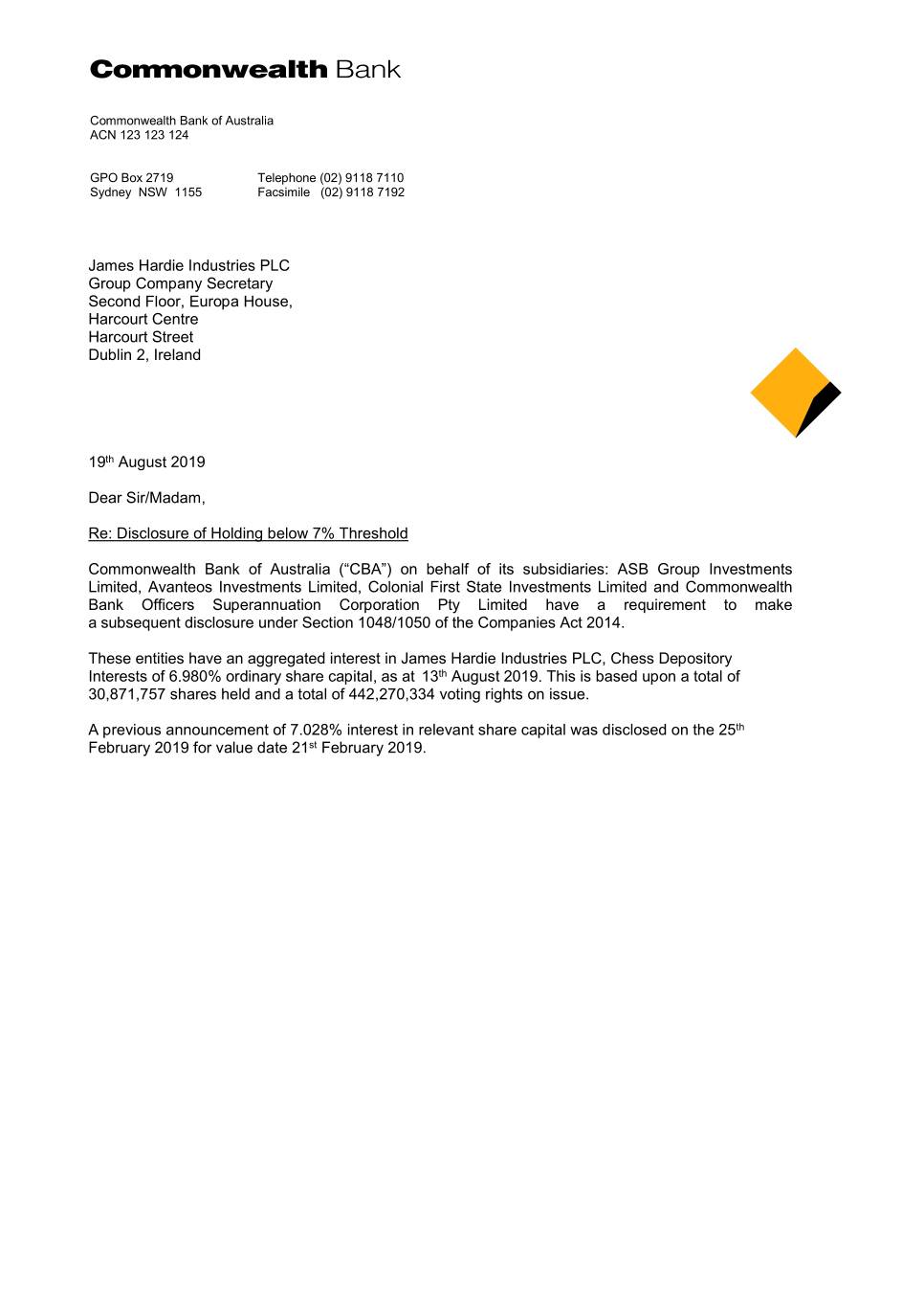 Commonwealth Bank of Australia ACN 123 123 124 GPO Box 2719 Telephone (02) 9118 7110 Sydney NSW 1155 Facsimile (02) 9118 7192 James Hardie Industries PLC Group Company Secretary Second Floor, Europa House, Harcourt Centre Harcourt Street Dublin 2, Ireland 19th August 2019 Dear Sir/Madam, Re: Disclosure of Holding below 7% Threshold Commonwealth Bank of Australia (“CBA”) on behalf of its subsidiaries: ASB Group Investments Limited, Avanteos Investments Limited, Colonial First State Investments Limited and Commonwealth Bank Officers Superannuation Corporation Pty Limited have a requirement to make asubsequent disclosure under Section 1048/1050 of the Companies Act 2014. These entities have an aggregated interest in James Hardie Industries PLC, Chess Depository Interests of 6.980% ordinary share capital, as at 13th August 2019. This is based upon a total of 30,871,757 shares held and a total of 442,270,334 voting rights on issue. A previous announcement of 7.028% interest in relevant share capital was disclosed on the 25th February 2019 for value date 21st February 2019.