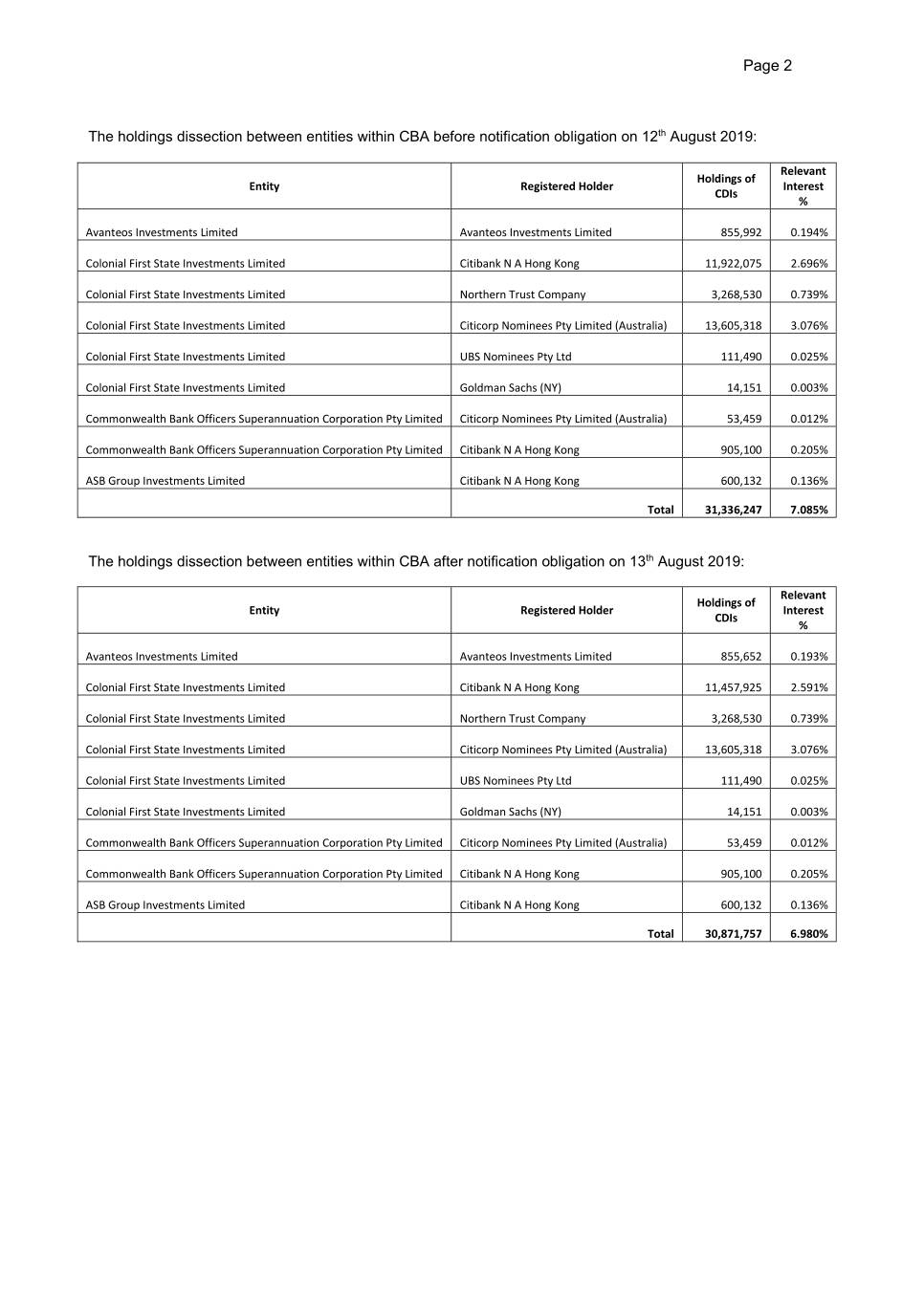 Page 2 The holdings dissection between entities within CBA before notification obligation on 12th August 2019: Relevant Holdings of Entity Registered Holder Interest CDIs % Avanteos Investments Limited Avanteos Investments Limited 855,992 0.194% Colonial First State Investments Limited Citibank N A Hong Kong 11,922,075 2.696% Colonial First State Investments Limited Northern Trust Company 3,268,530 0.739% Colonial First State Investments Limited Citicorp Nominees Pty Limited (Australia) 13,605,318 3.076% Colonial First State Investments Limited UBS Nominees Pty Ltd 111,490 0.025% Colonial First State Investments Limited Goldman Sachs (NY) 14,151 0.003% Commonwealth Bank Officers Superannuation Corporation Pty Limited Citicorp Nominees Pty Limited (Australia) 53,459 0.012% Commonwealth Bank Officers Superannuation Corporation Pty Limited Citibank N A Hong Kong 905,100 0.205% ASB Group Investments Limited Citibank N A Hong Kong 600,132 0.136% Total 31,336,247 7.085% The holdings dissection between entities within CBA after notification obligation on 13th August 2019: Relevant Holdings of Entity Registered Holder Interest CDIs % Avanteos Investments Limited Avanteos Investments Limited 855,652 0.193% Colonial First State Investments Limited Citibank N A Hong Kong 11,457,925 2.591% Colonial First State Investments Limited Northern Trust Company 3,268,530 0.739% Colonial First State Investments Limited Citicorp Nominees Pty Limited (Australia) 13,605,318 3.076% Colonial First State Investments Limited UBS Nominees Pty Ltd 111,490 0.025% Colonial First State Investments Limited Goldman Sachs (NY) 14,151 0.003% Commonwealth Bank Officers Superannuation Corporation Pty Limited Citicorp Nominees Pty Limited (Australia) 53,459 0.012% Commonwealth Bank Officers Superannuation Corporation Pty Limited Citibank N A Hong Kong 905,100 0.205% ASB Group Investments Limited Citibank N A Hong Kong 600,132 0.136% Total 30,871,757 6.980%