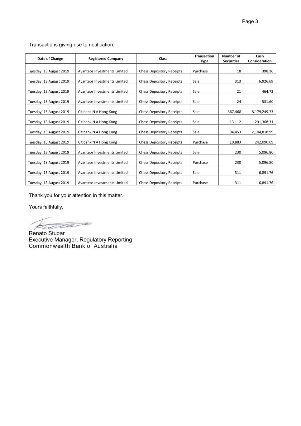 Page 3 Transactions giving rise to notification: Transaction Number of Cash Date of Change Registered Company Class Type Securities Consideration Tuesday, 13 August 2019 Avanteos Investments Limited Chess Depository Receipts Purchase 18 398.16 Tuesday, 13 August 2019 Avanteos Investments Limited Chess Depository Receipts Sale 313 6,926.69 Tuesday, 13 August 2019 Avanteos Investments Limited Chess Depository Receipts Sale 21 464.73 Tuesday, 13 August 2019 Avanteos Investments Limited Chess Depository Receipts Sale 24 531.60 Tuesday, 13 August 2019 Citibank N A Hong Kong Chess Depository Receipts Sale 367,468 8,179,249.73 Tuesday, 13 August 2019 Citibank N A Hong Kong Chess Depository Receipts Sale 13,112 291,368.31 Tuesday, 13 August 2019 Citibank N A Hong Kong Chess Depository Receipts Sale 94,453 2,104,818.99 Tuesday, 13 August 2019 Citibank N A Hong Kong Chess Depository Receipts Purchase 10,883 242,096.69 Tuesday, 13 August 2019 Avanteos Investments Limited Chess Depository Receipts Sale 230 5,096.80 Tuesday, 13 August 2019 Avanteos Investments Limited Chess Depository Receipts Purchase 230 5,096.80 Tuesday, 13 August 2019 Avanteos Investments Limited Chess Depository Receipts Sale 311 6,891.76 Tuesday, 13 August 2019 Avanteos Investments Limited Chess Depository Receipts Purchase 311 6,891.76 Thank you for your attention in this matter. Yours faithfully, Renato Stupar Executive Manager, Regulatory Reporting Commonwealth Bank of Australia