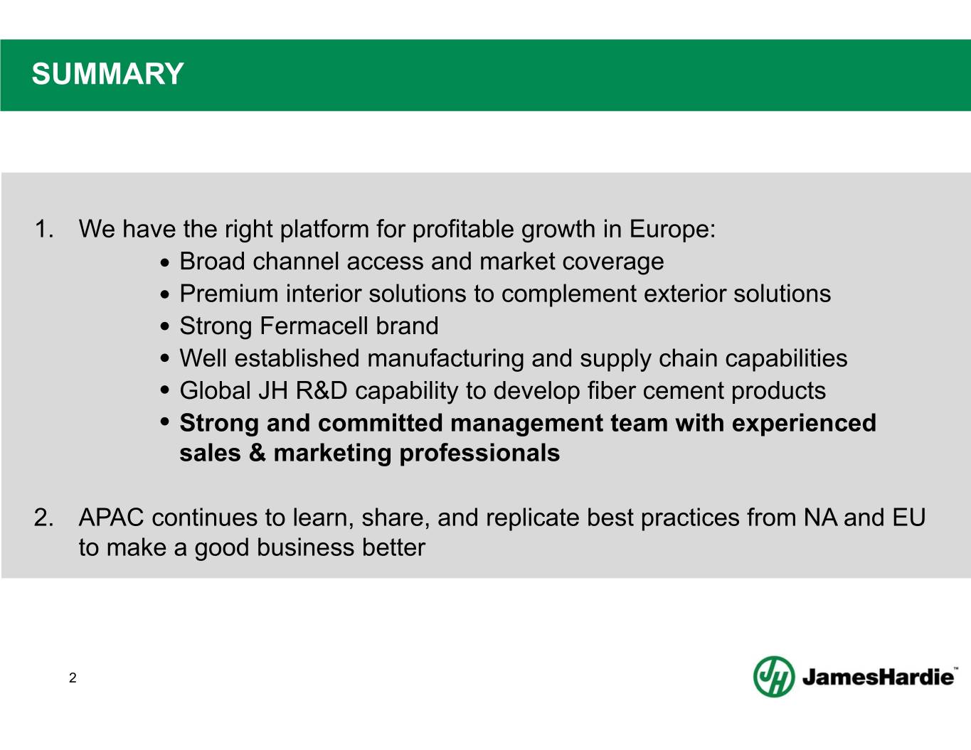 SUMMARY 1. We have the right platform for profitable growth in Europe: Broad channel access and market coverage Premium interior solutions to complement exterior solutions Strong Fermacell brand Well established manufacturing and supply chain capabilities Global JH R&D capability to develop fiber cement products Strong and committed management team with experienced sales & marketing professionals 2. APAC continues to learn, share, and replicate best practices from NA and EU to make a good business better 2
