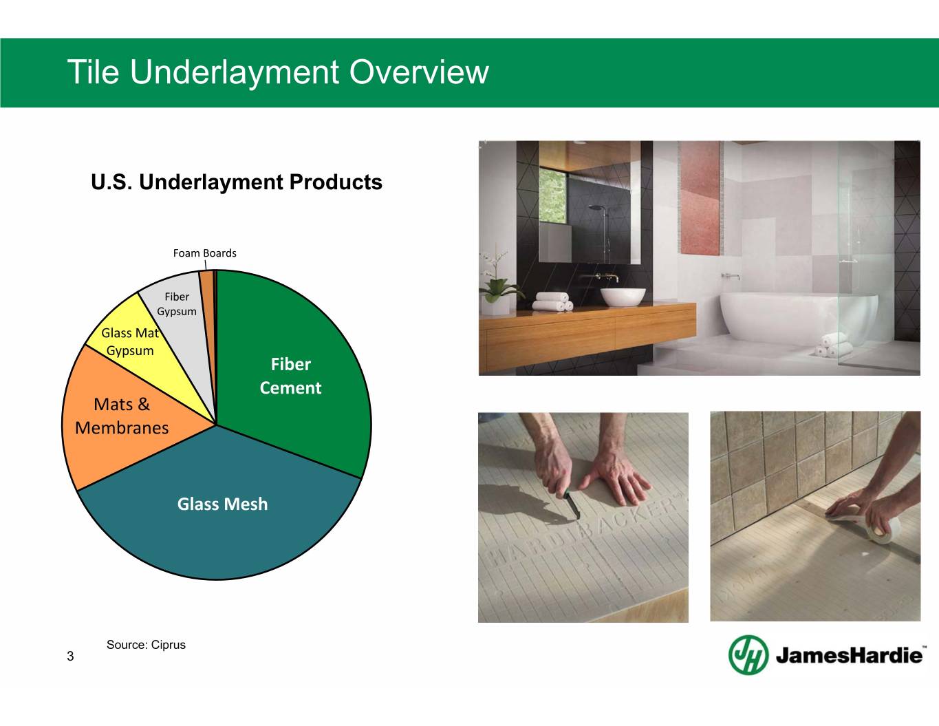 Tile Underlayment Overview U.S. Underlayment Products Foam Boards Fiber Gypsum Glass Mat Gypsum Fiber Cement Mats & Membranes Glass Mesh Source: Ciprus 3
