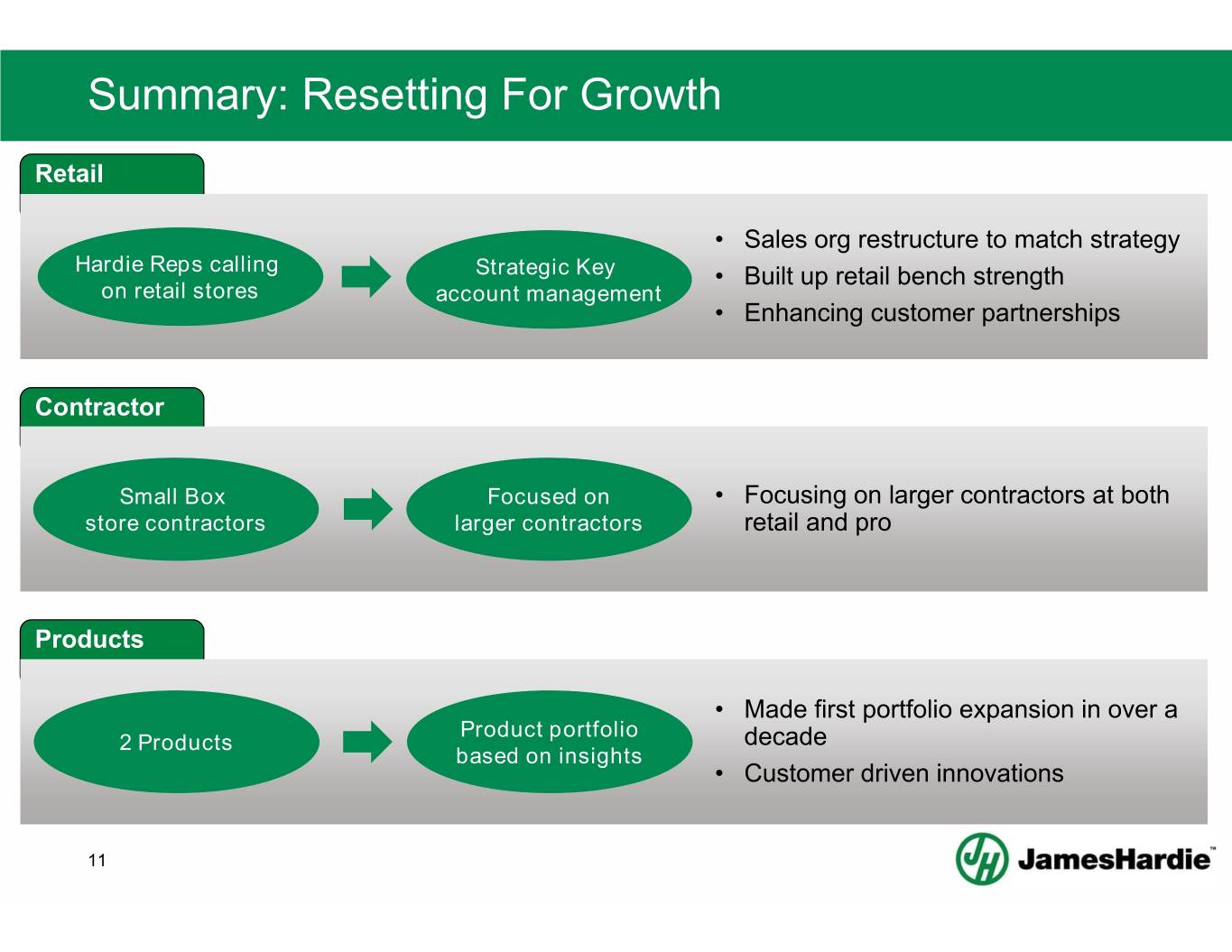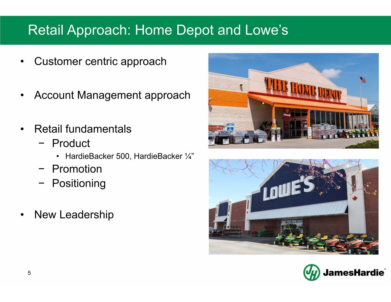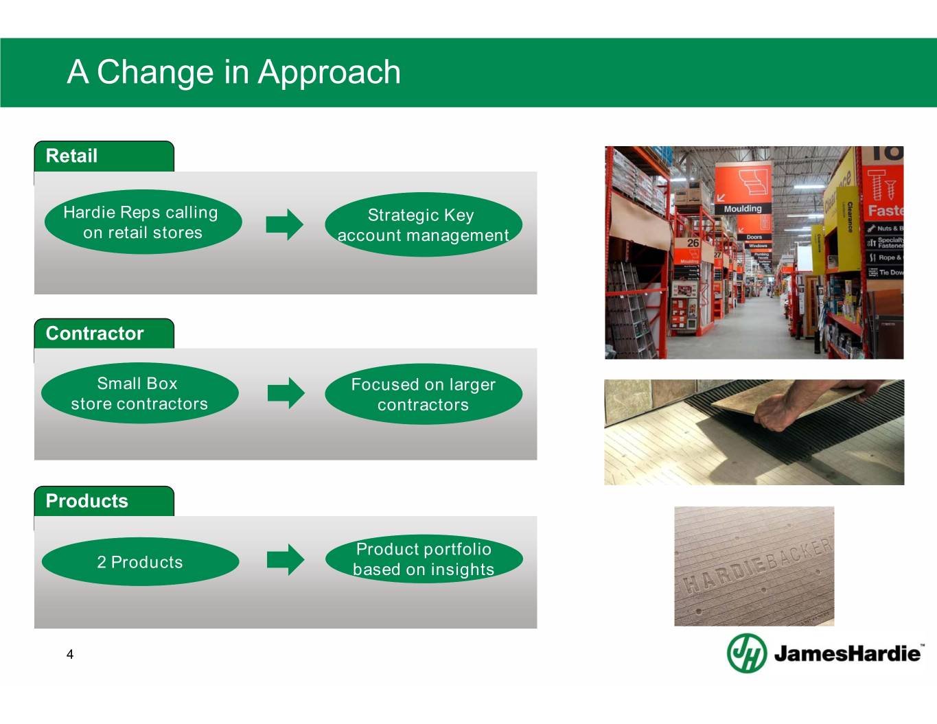 A Change in Approach Retail Hardie Reps calling Strategic Key on retail stores account management Contractor Small Box Focused on larger store contractors contractors Products Product portfolio 2 Products based on insights 4