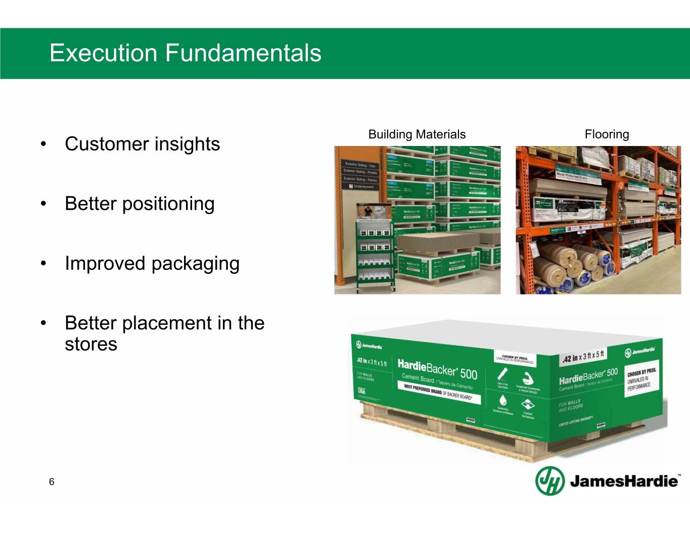 Retail Approach: Home Depot and Lowe’s • Customer centric approach • Account Management approach • Retail fundamentals − Product • HardieBacker 500, HardieBacker ¼” − Promotion − Positioning • New Leadership 5