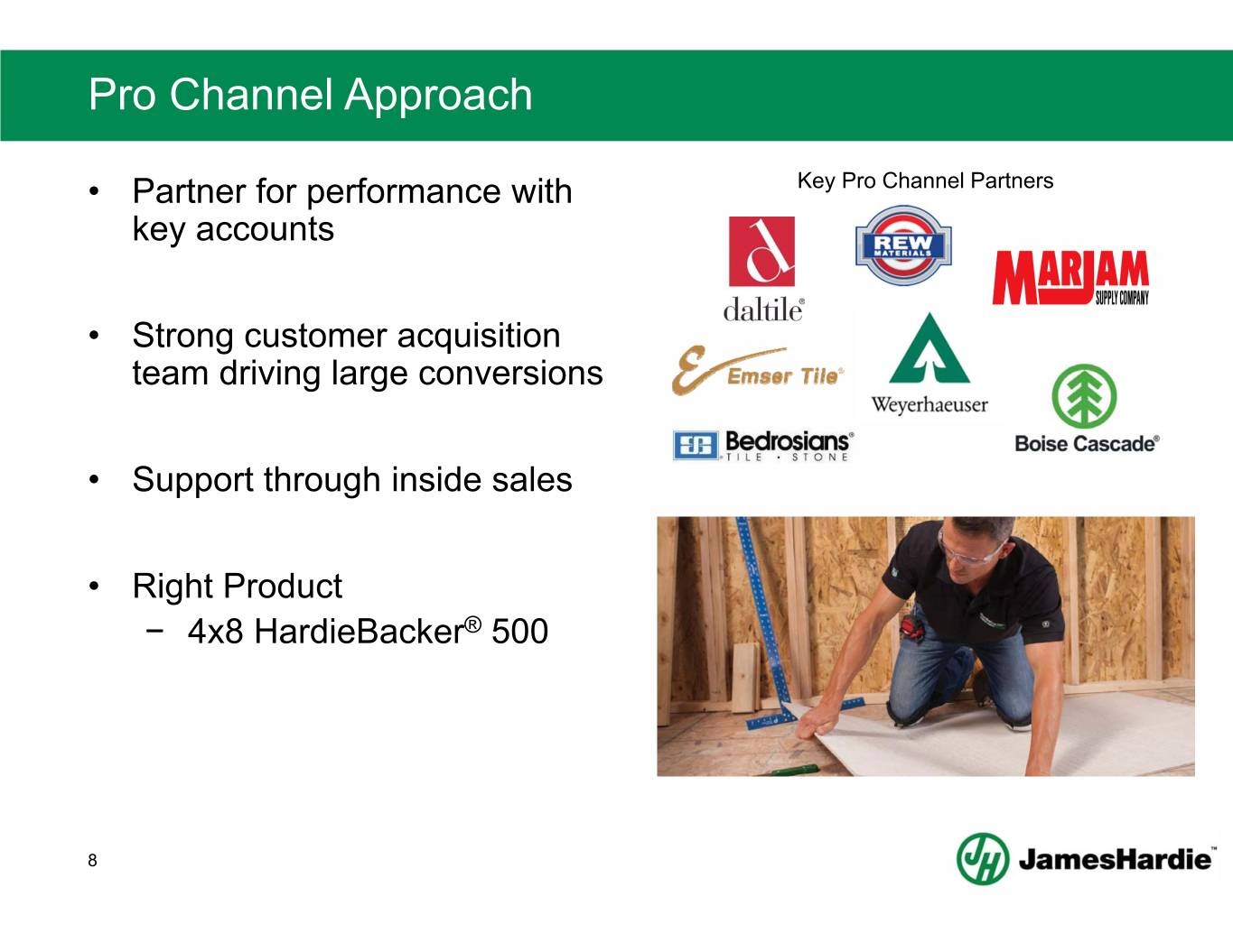 Pro Channel Approach • Partner for performance with Key Pro Channel Partners key accounts • Strong customer acquisition team driving large conversions • Support through inside sales • Right Product − 4x8 HardieBacker® 500 8