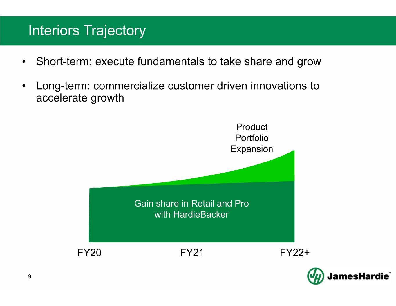 Interiors Trajectory • Short-term: execute fundamentals to take share and grow • Long-term: commercialize customer driven innovations to accelerate growth Product Portfolio Expansion Gain share in Retail and Pro with HardieBacker FY20 FY21 FY22+ 9
