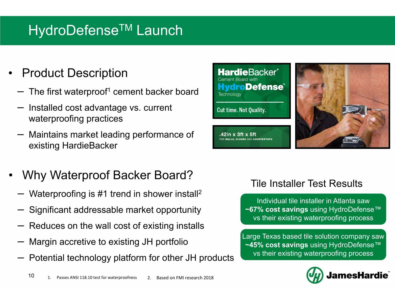 HydroDefenseTM Launch • Product Description ‒ The first waterproof1 cement backer board ‒ Installed cost advantage vs. current waterproofing practices ‒ Maintains market leading performance of existing HardieBacker • Why Waterproof Backer Board? Tile Installer Test Results ‒ Waterproofing is #1 trend in shower install2 Individual tile installer in Atlanta saw ‒ Significant addressable market opportunity ~67% cost savings using HydroDefense™ vs their existing waterproofing process ‒ Reduces on the wall cost of existing installs Large Texas based tile solution company saw ‒ Margin accretive to existing JH portfolio ~45% cost savings using HydroDefense™ ‒ Potential technology platform for other JH products vs their existing waterproofing process 10 1. Passes ANSI 118.10 test for waterproofness 2. Based on FMI research 2018