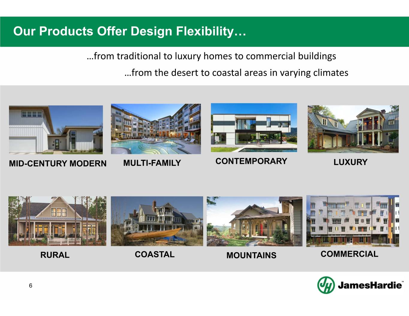 …with a Broad Portfolio of Products & Brands PRODUCT PLATFORMS Trim / Tile Commercial Siding Soffit Flooring Interior Walls Fiber Gypsum Fascia Backerboard Exteriors PORTFOLIO OF BRANDS 5