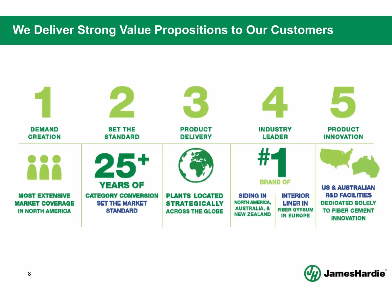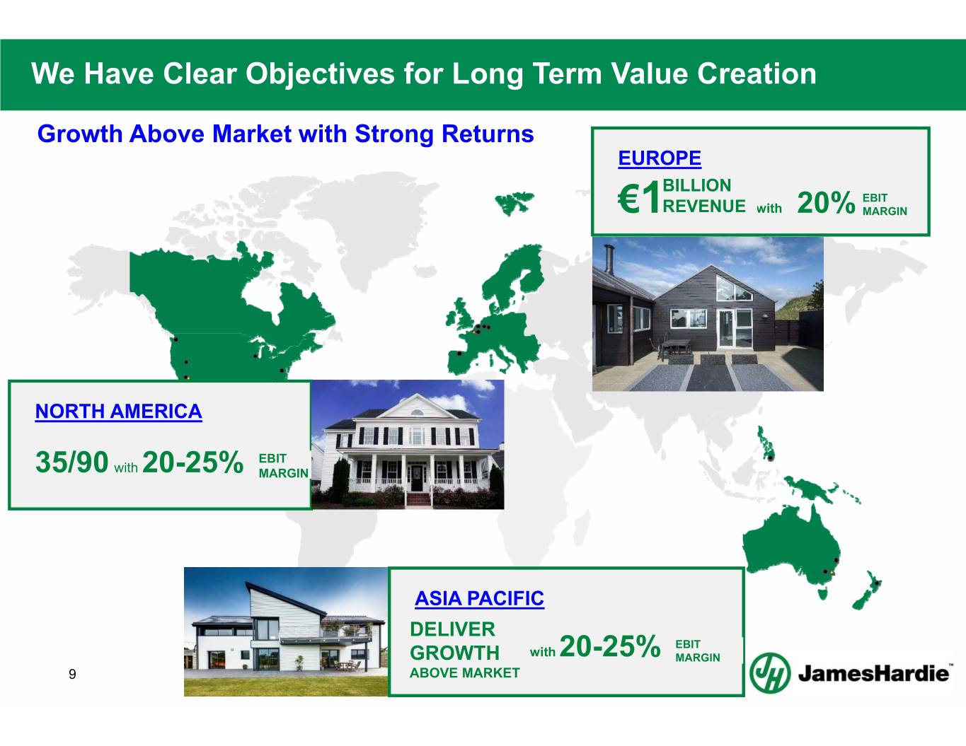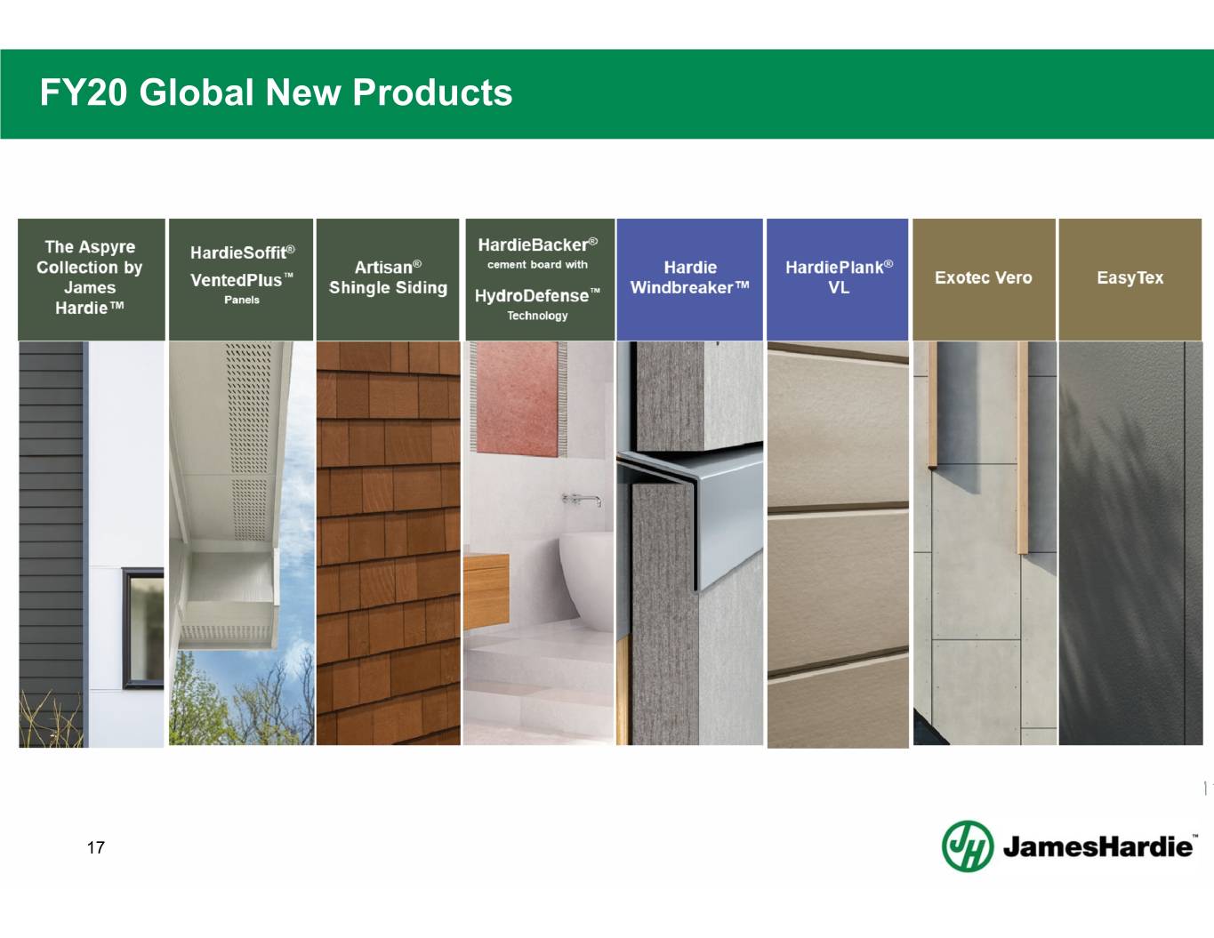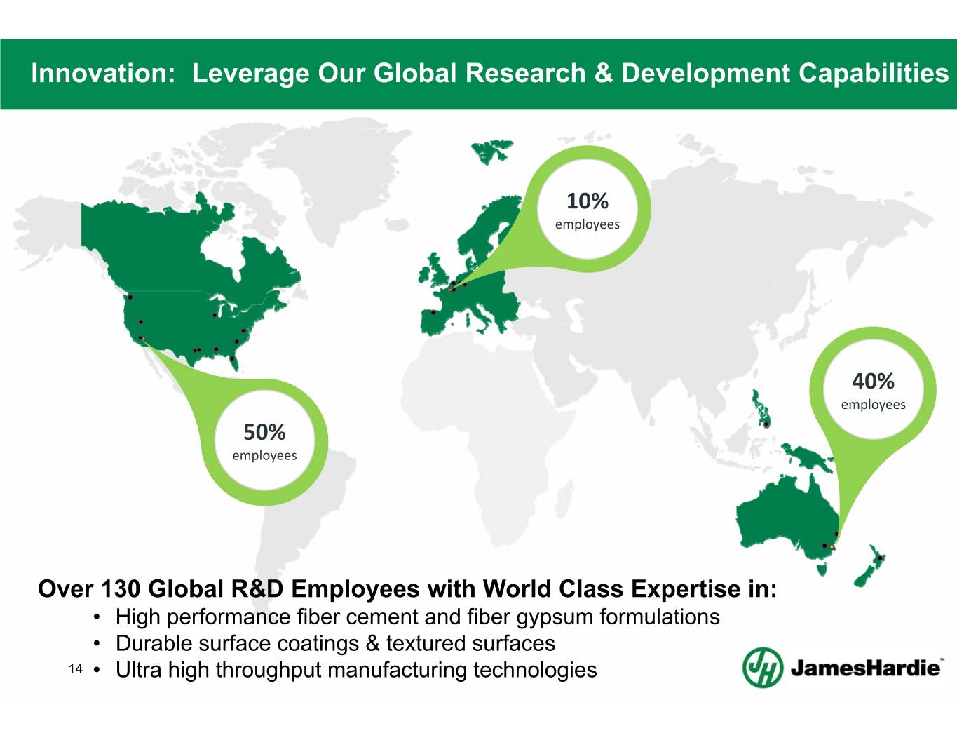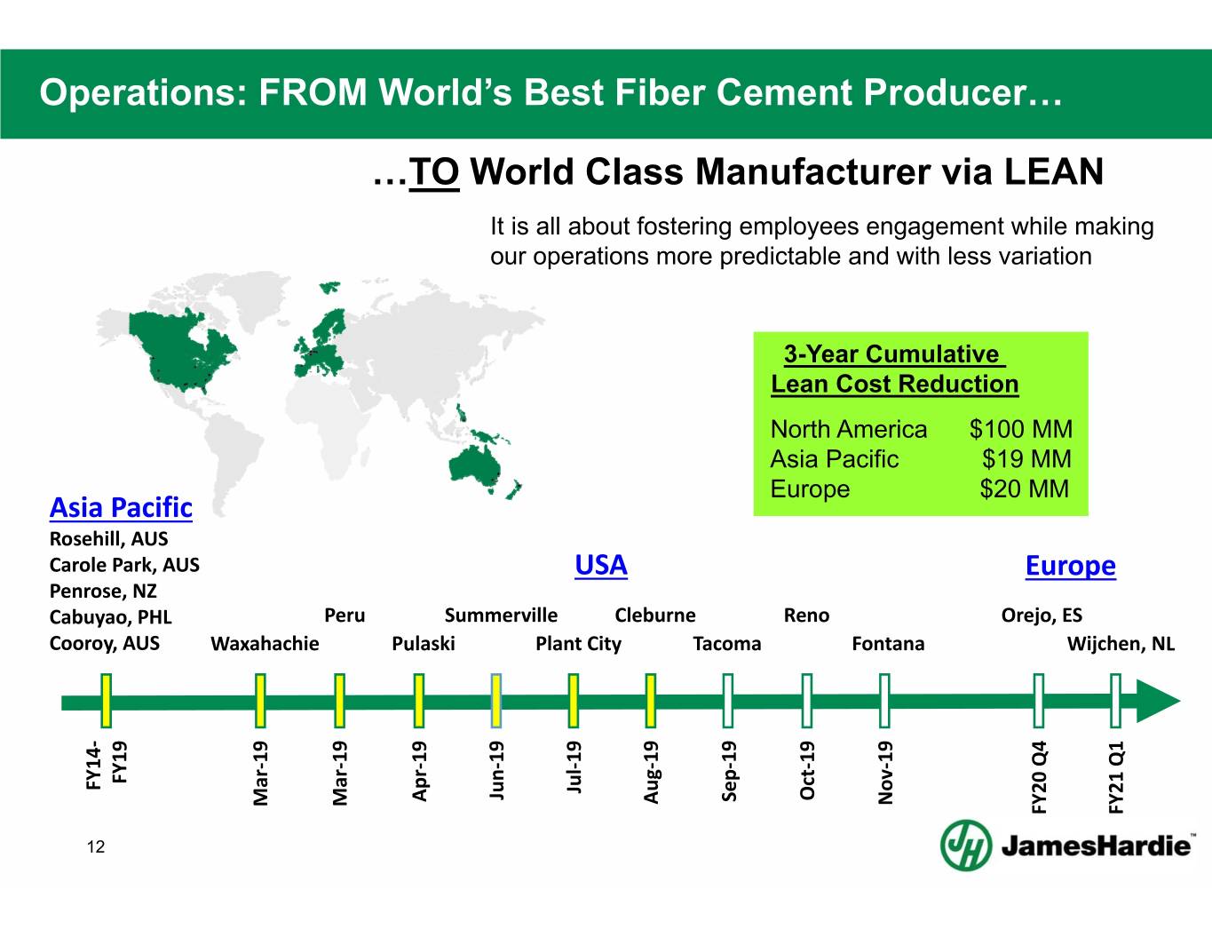 Operations: FROM World’s Best Fiber Cement Producer… …TO World Class Manufacturer via LEAN It is all about fostering employees engagement while making our operations more predictable and with less variation 3-Year Cumulative Lean Cost Reduction North America $100 MM Asia Pacific $19 MM Europe $20 MM Asia Pacific Rosehill, AUS Carole Park, AUS USA Europe Penrose, NZ Cabuyao, PHL Peru Summerville Cleburne Reno Orejo, ES Cooroy, AUS Waxahachie Pulaski Plant City Tacoma Fontana Wijchen, NL FY19 FY14‐ Jul‐19 Jun‐19 Oct‐19 Apr‐19 Sep‐19 Aug‐19 Nov‐19 Mar‐19 Mar‐19 FY20 Q4 FY21 Q1 12