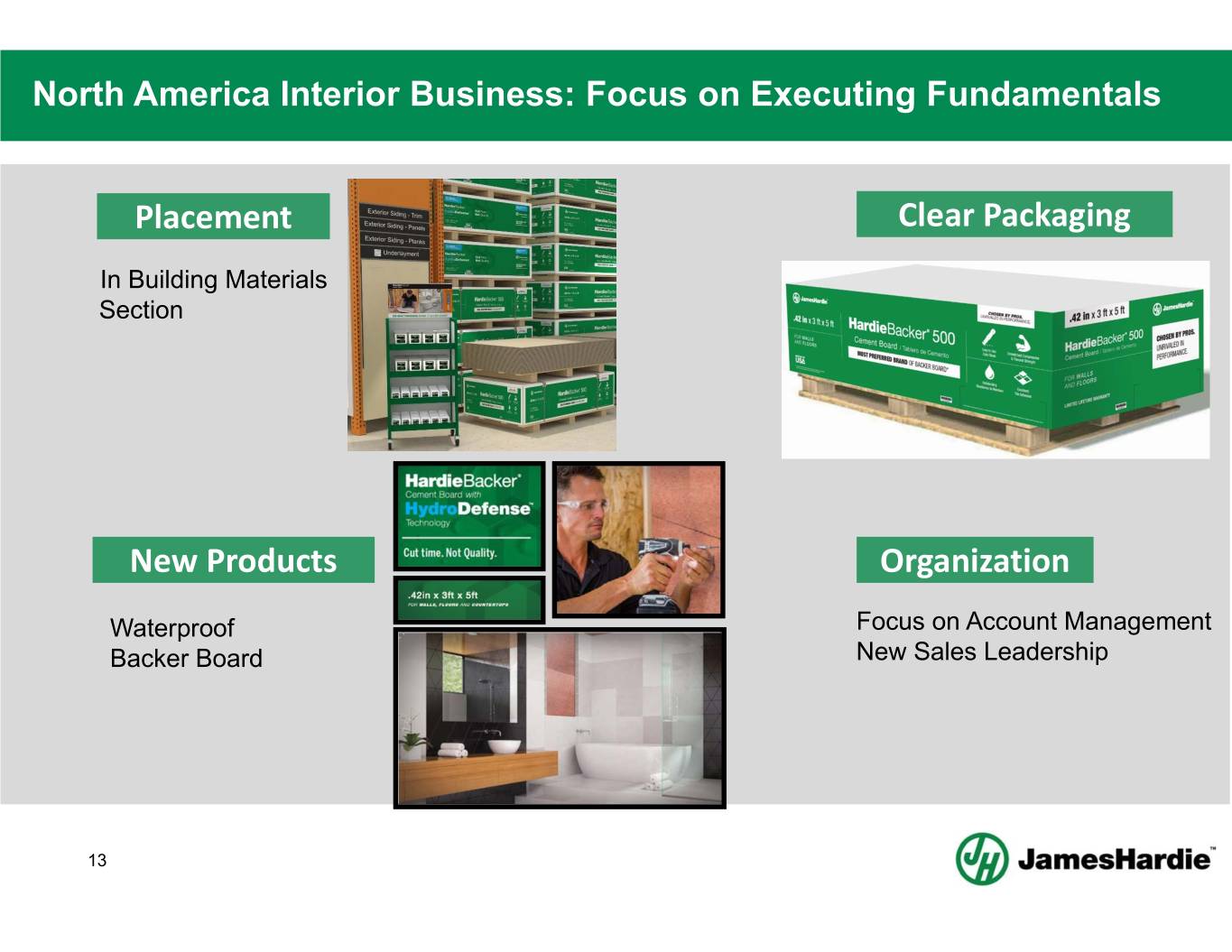 North America Interior Business: Focus on Executing Fundamentals Placement Clear Packaging In Building Materials Section New Products Organization Waterproof Focus on Account Management Backer Board New Sales Leadership 13