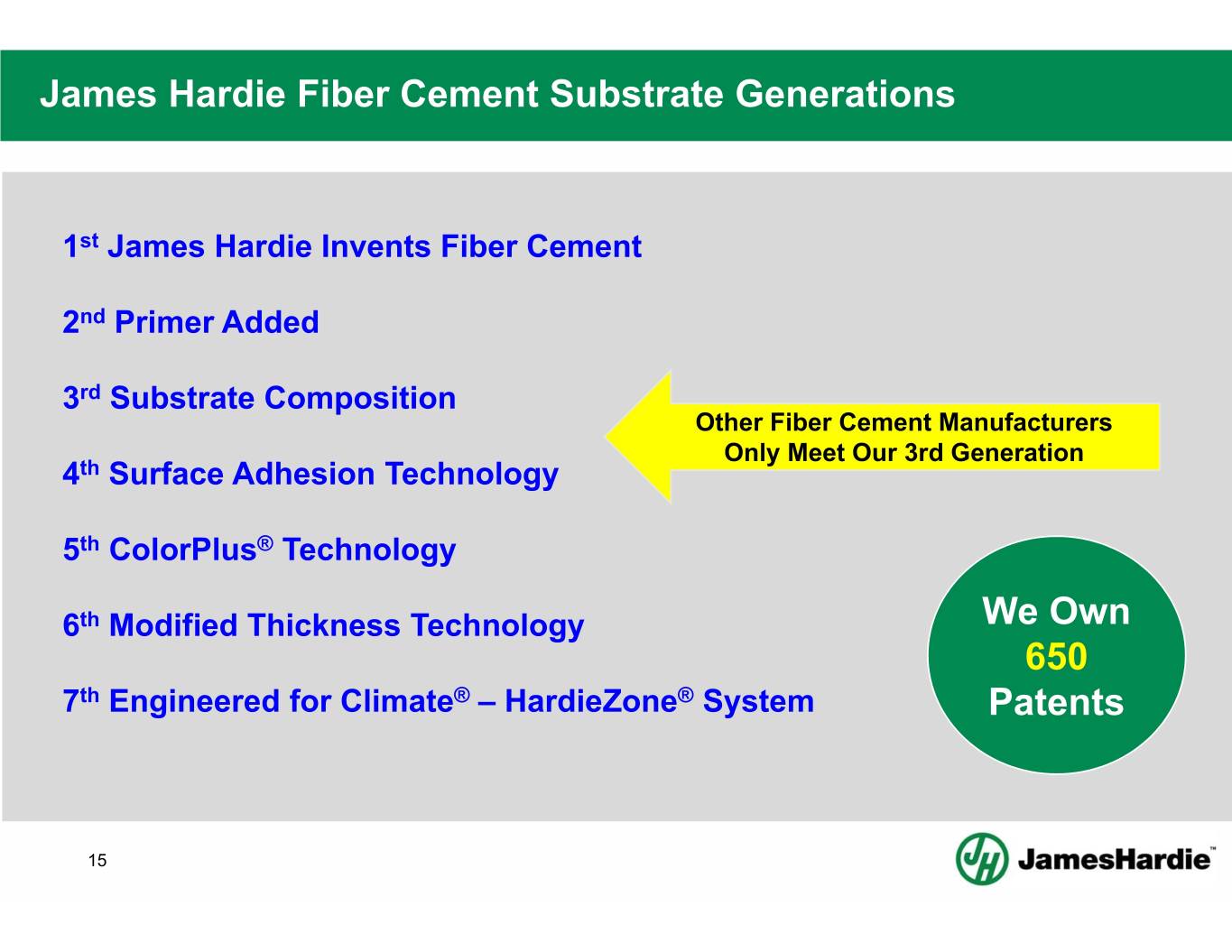 James Hardie Fiber Cement Substrate Generations 1st James Hardie Invents Fiber Cement 2nd Primer Added 3rd Substrate Composition Other Fiber Cement Manufacturers Only Meet Our 3rd Generation 4th Surface Adhesion Technology 5th ColorPlus® Technology 6th Modified Thickness Technology We Own 650 7th Engineered for Climate® – HardieZone® System Patents 15