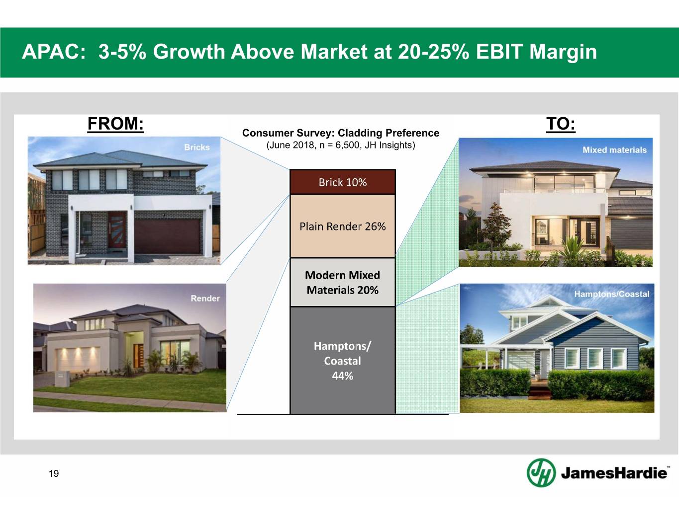 APAC: 3-5% Growth Above Market at 20-25% EBIT Margin FROM: TO: Consumer Survey: Cladding Preference (June 2018, n = 6,500, JH Insights) 19