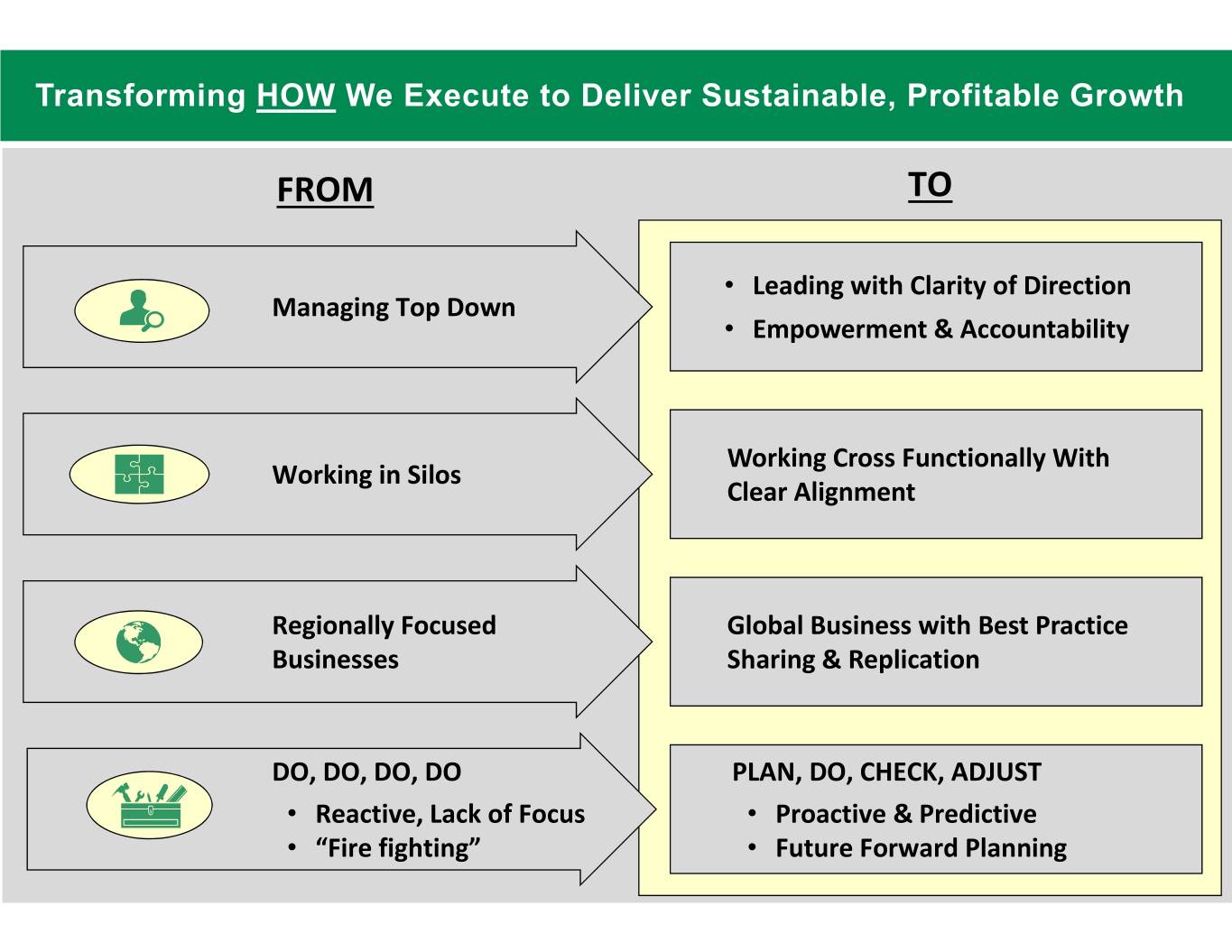 Transforming HOW We Execute to Deliver Sustainable, Profitable Growth FROM TO • Leading with Clarity of Direction Managing Top Down • Empowerment & Accountability Working Cross Functionally With Working in Silos Clear Alignment Regionally Focused Global Business with Best Practice Businesses Sharing & Replication DO, DO, DO, DO PLAN, DO, CHECK, ADJUST • Reactive, Lack of Focus • Proactive & Predictive 20 • “Fire fighting” • Future Forward Planning