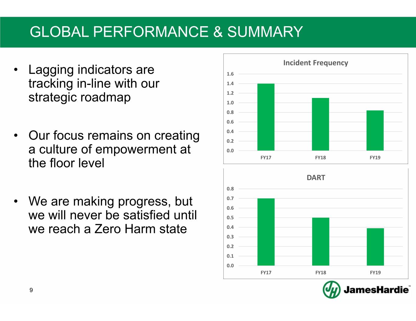 SAFE PLACES – GLOBAL MINDSET • One JH standard in our plants accelerates best practice replication • Global best practices, benchmarked to world class levels, with strong local ownership − 5S replication – standardization − Pedestrian/Forklift standardization leads global improvement team Before After North America North America APAC 8