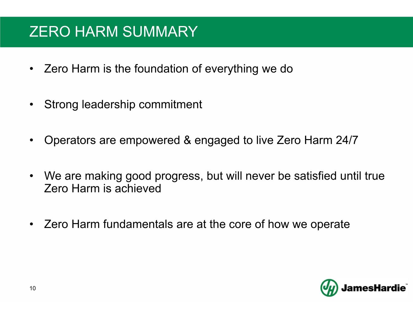 GLOBAL PERFORMANCE & SUMMARY Incident Frequency • Lagging indicators are 1.6 tracking in-line with our 1.4 1.2 strategic roadmap 1.0 0.8 0.6 0.4 • Our focus remains on creating 0.2 a culture of empowerment at 0.0 the floor level FY17 FY18 FY19 DART 0.8 0.7 • We are making progress, but 0.6 we will never be satisfied until 0.5 we reach a Zero Harm state 0.4 0.3 0.2 0.1 0.0 FY17 FY18 FY19 9