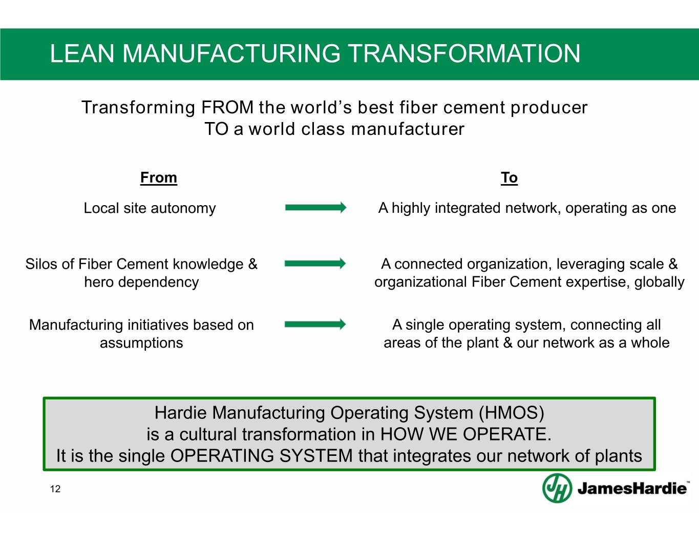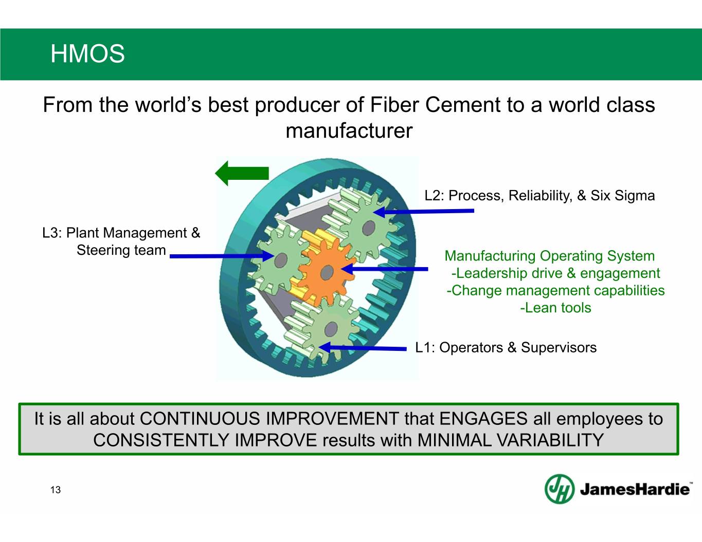 LEAN MANUFACTURING TRANSFORMATION Transforming FROM the world’s best fiber cement producer TO a world class manufacturer From To Local site autonomy A highly integrated network, operating as one Silos of Fiber Cement knowledge & A connected organization, leveraging scale & hero dependency organizational Fiber Cement expertise, globally Manufacturing initiatives based on A single operating system, connecting all assumptions areas of the plant & our network as a whole Hardie Manufacturing Operating System (HMOS) is a cultural transformation in HOW WE OPERATE. It is the single OPERATING SYSTEM that integrates our network of plants 12