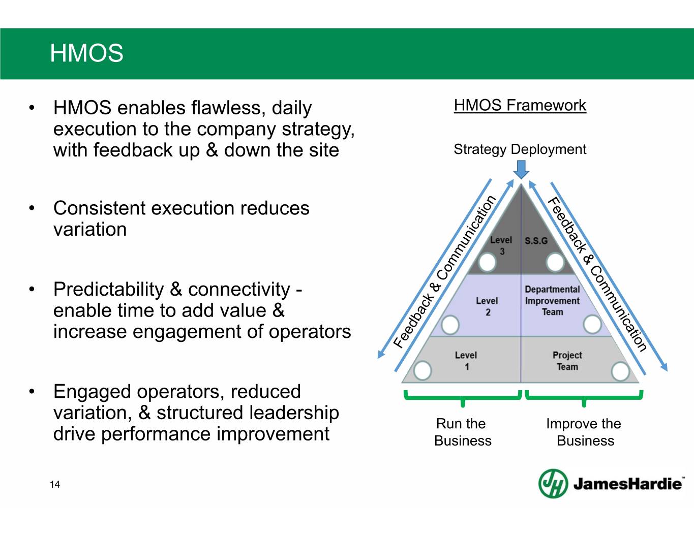 HMOS From the world’s best producer of Fiber Cement to a world class manufacturer L2: Process, Reliability, & Six Sigma L3: Plant Management & Steering team Manufacturing Operating System -Leadership drive & engagement -Change management capabilities -Lean tools L1: Operators & Supervisors It is all about CONTINUOUS IMPROVEMENT that ENGAGES all employees to CONSISTENTLY IMPROVE results with MINIMAL VARIABILITY 13