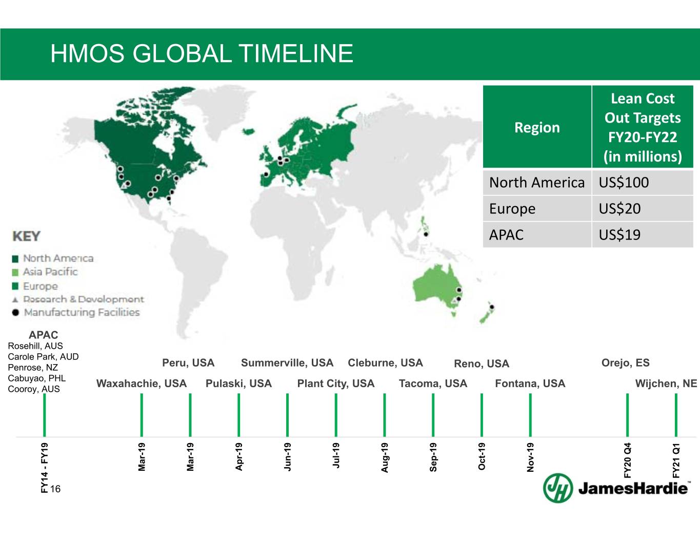 HMOS GLOBAL TIMELINE Lean Cost Out Targets Region FY20‐FY22 (in millions) North America US$100 Europe US$20 APAC US$19 APAC Rosehill, AUS Carole Park, AUD Penrose, NZ Peru, USA Summerville, USA Cleburne, USA Reno, USA Orejo, ES Cabuyao, PHL Waxahachie, USA Pulaski, USA Plant City, USA Tacoma, USA Fontana, USA Wijchen, NE Cooroy, AUS Jul-19 Oct-19 Apr-19 Jun-19 Mar-19 Mar-19 Sep-19 Nov-19 Aug-19 FY20 Q4 FY21 Q1 FY14 FY19 - 16