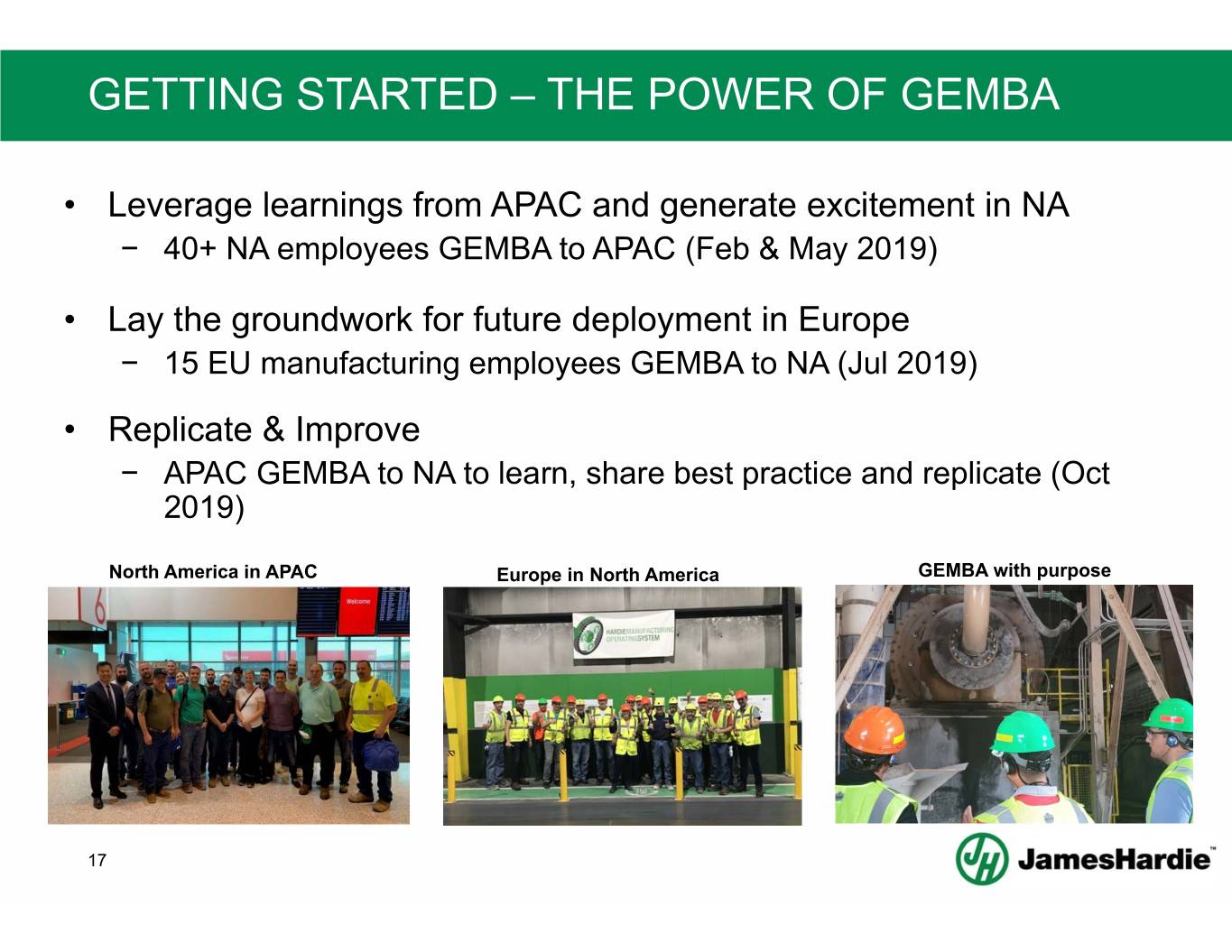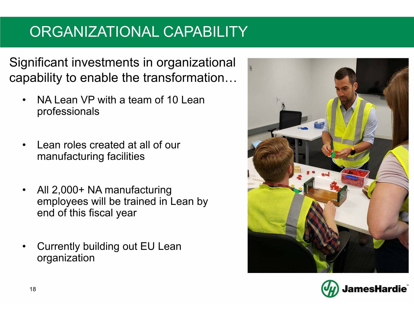 GETTING STARTED – THE POWER OF GEMBA • Leverage learnings from APAC and generate excitement in NA − 40+ NA employees GEMBA to APAC (Feb & May 2019) • Lay the groundwork for future deployment in Europe − 15 EU manufacturing employees GEMBA to NA (Jul 2019) • Replicate & Improve − APAC GEMBA to NA to learn, share best practice and replicate (Oct 2019) North America in APAC Europe in North America GEMBA with purpose 17